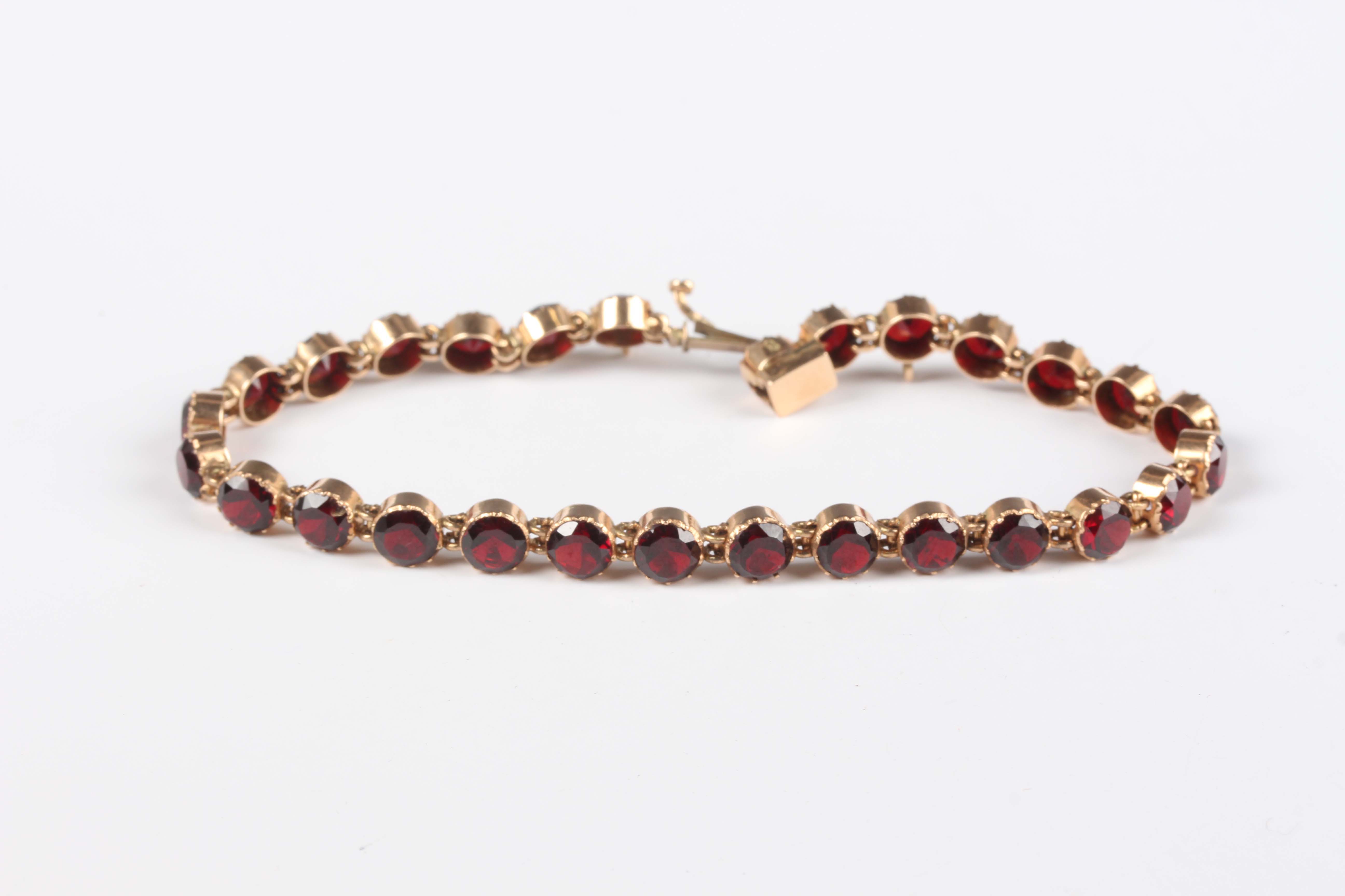 An Austro-Hungarian gold and garnet bracelet, mounted with a row of circular cut garnets, on a snap clasp, weight 10g, length 19.2cm.