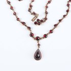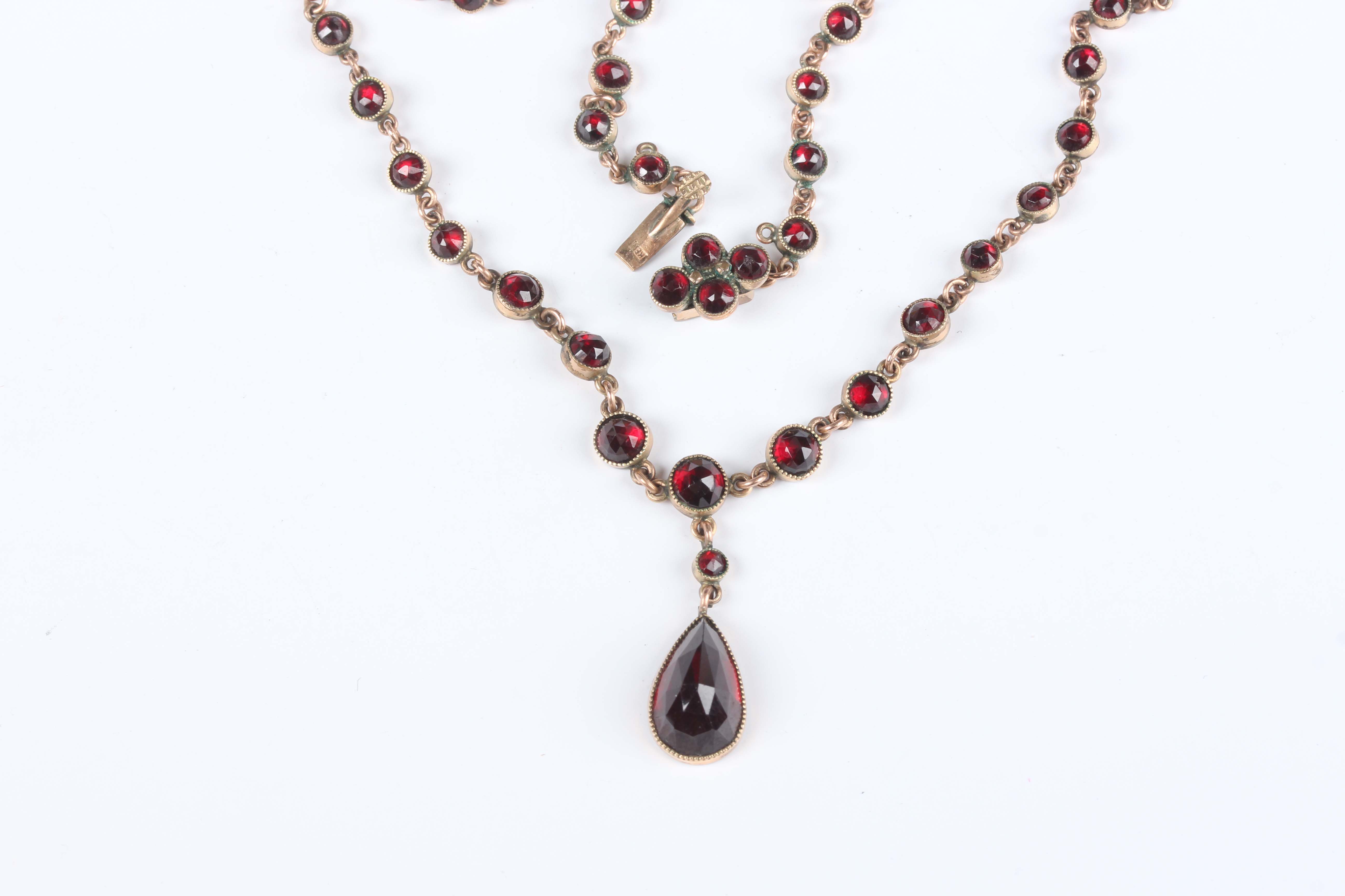 A gilt metal and Bohemian garnet necklace, the front with a drop shaped pendant, on a snap clasp, length 42.5cm.