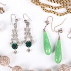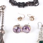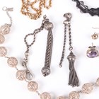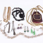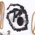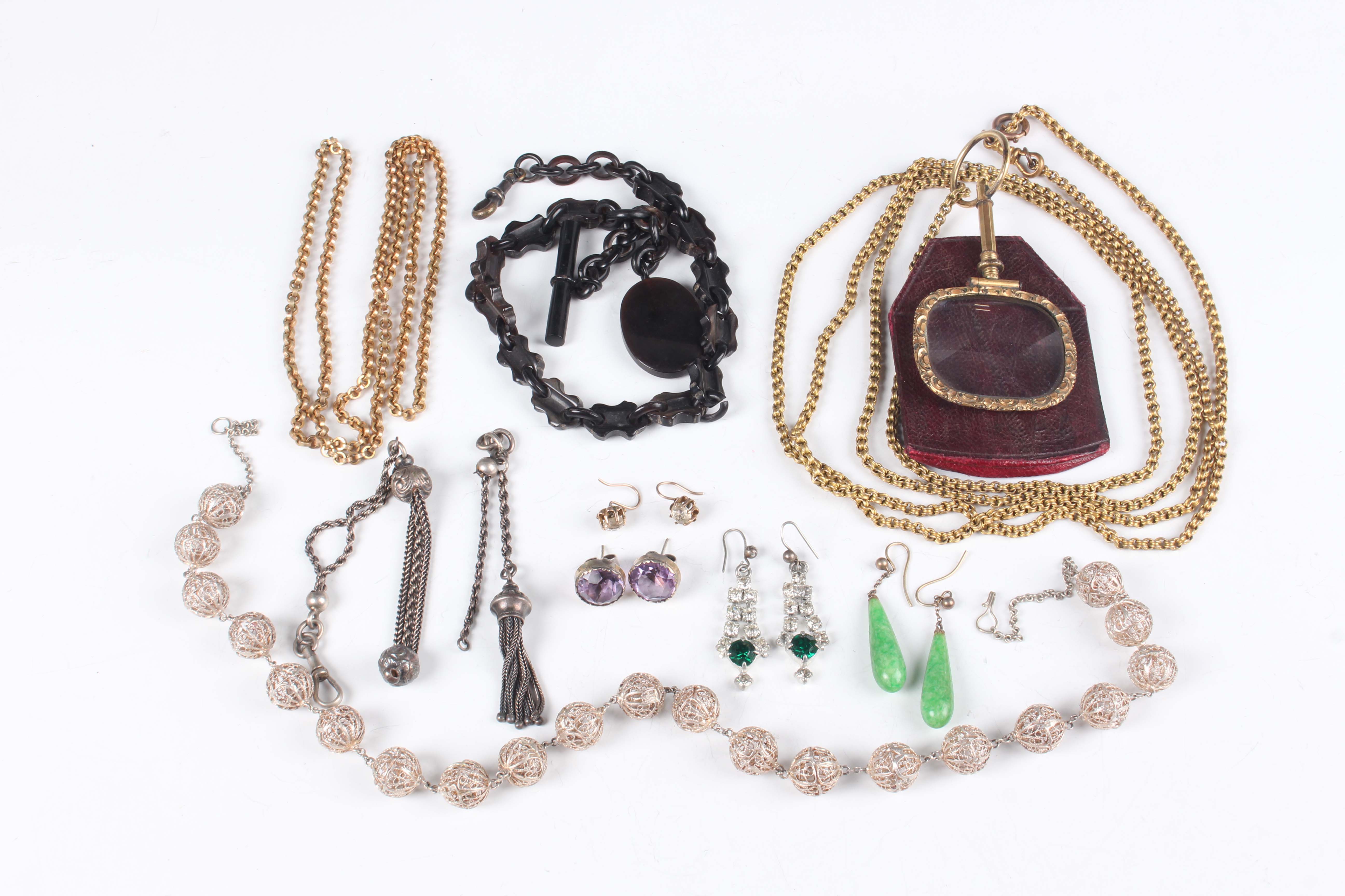 A group of jewellery, comprising a Victorian gilt metal mounted spyglass, with a slip case and a gilt long guard chain, another gilt metal neckchain, a filigree bead necklace, an oval pendant, fitted to a watch chain, a dress Albertine (in two sections), a pair of green and colourless paste earrings and three further pairs of earrings.