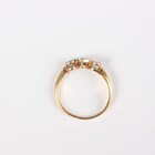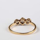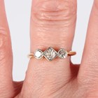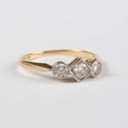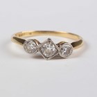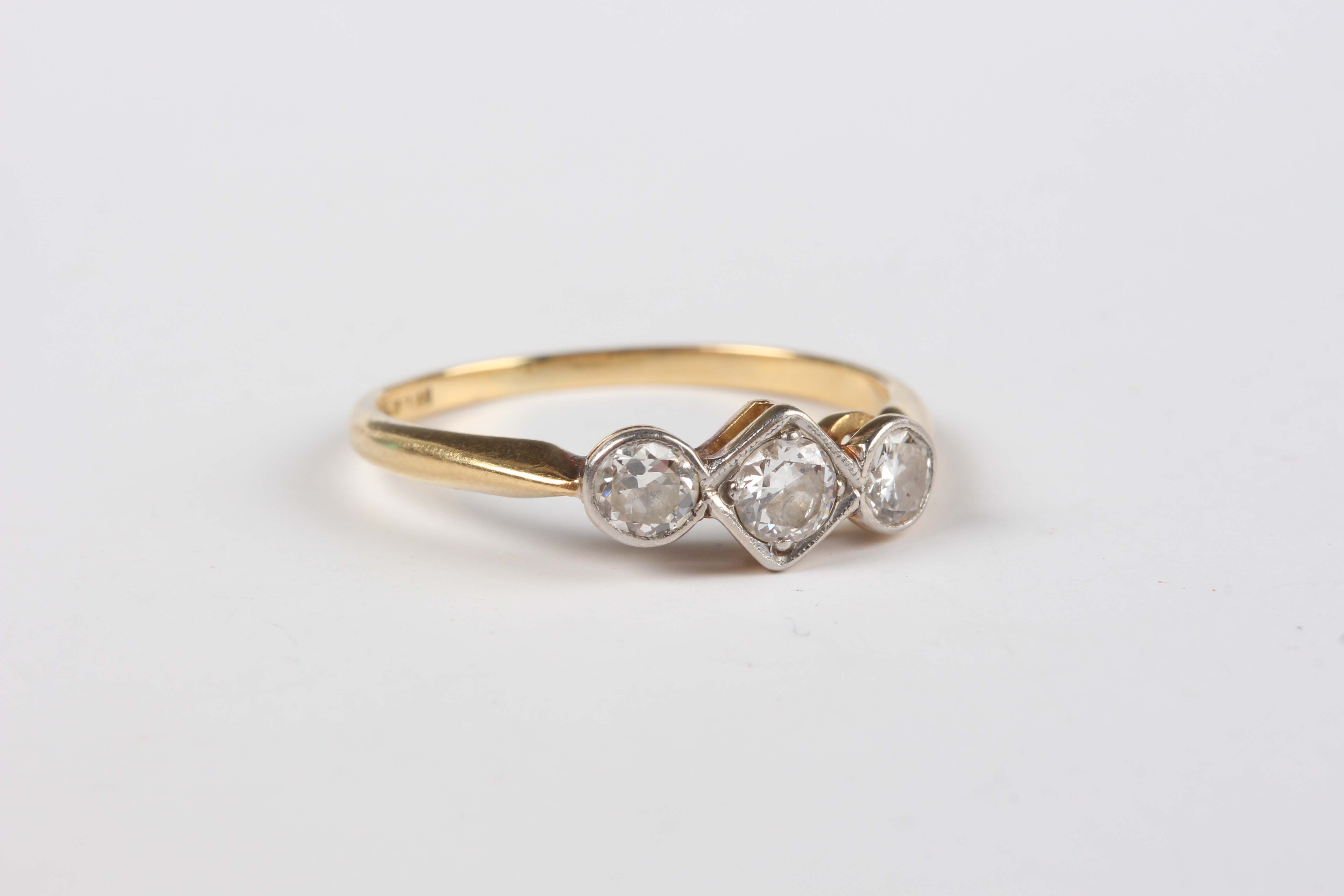 A gold, platinum and diamond three stone ring, the central diamond mounted within a square shaped setting, detailed '18ct & Pt', weight 2.2g, ring size approx M.