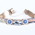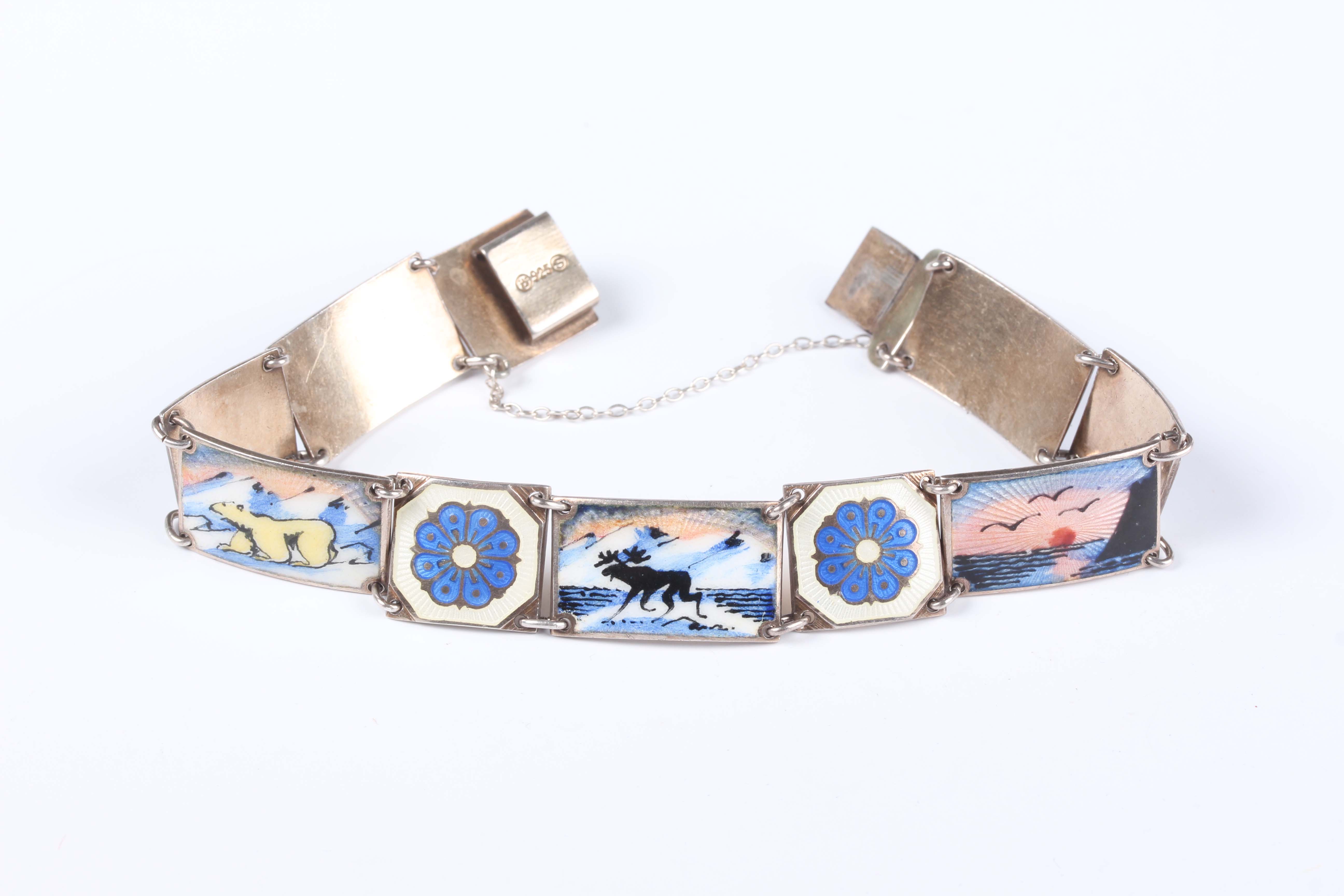 A Scandinavian .925 silver gilt and enamelled panel link bracelet, decorated with various snow scenes alternating with floral medallions, weight 25.3g, length 20cm.