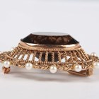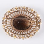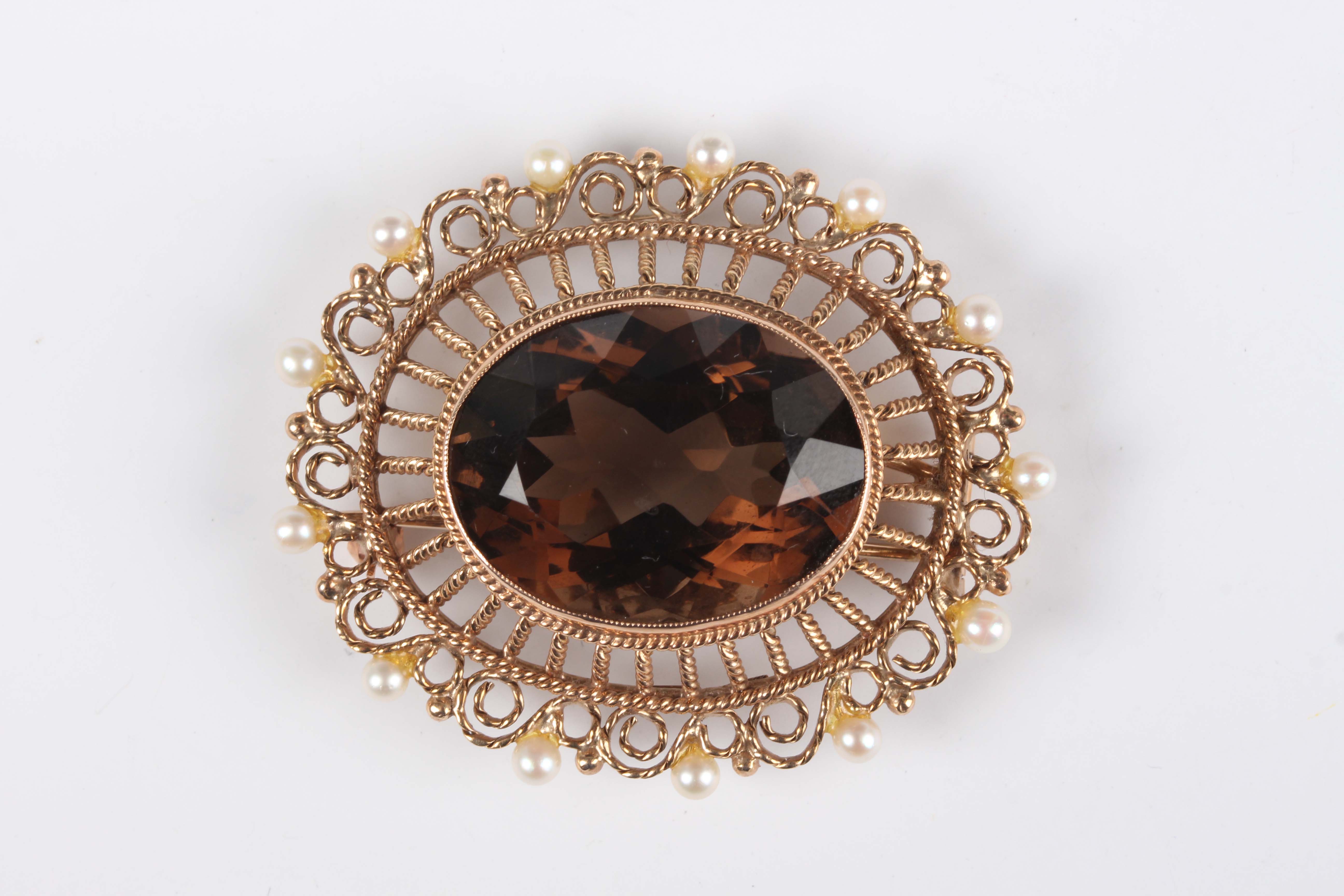 A gold, smoky quartz and seed pearl oval pendant brooch, collet set with the oval cut smoky quartz within a wirework surround, set with seed pearls at intervals, detailed 'Zeeta 9ct', weight 16.5g, width 4.7cm.