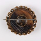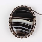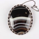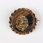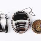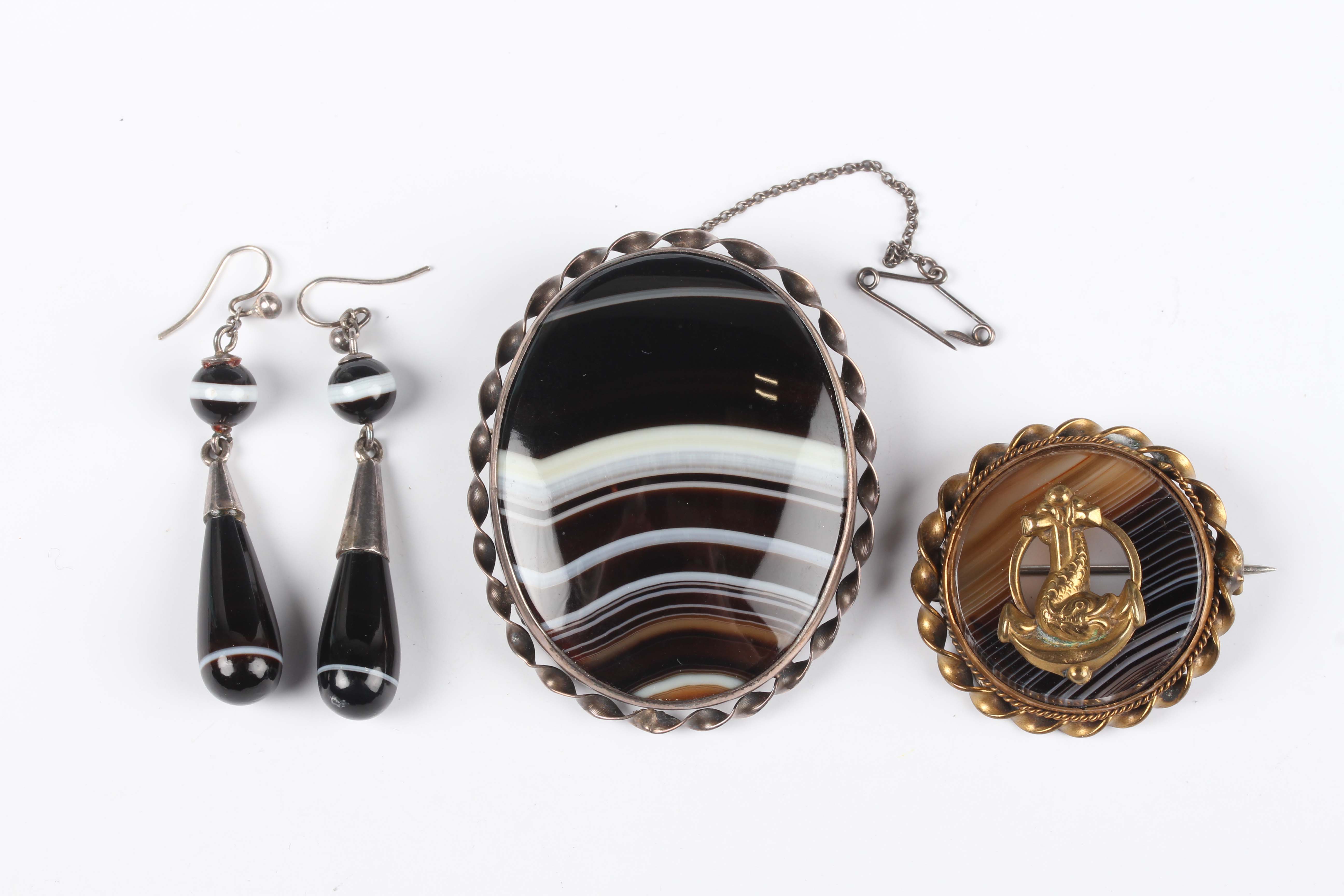 A Victorian banded agate oval brooch within a ribbon twist border, width 4.3cm, length 5.2cm, a pair of banded agate drop shaped pendant earrings, length 5.3cm, and a gilt metal mounted circular banded agate brooch with a dolphin and anchor motif.