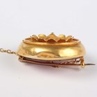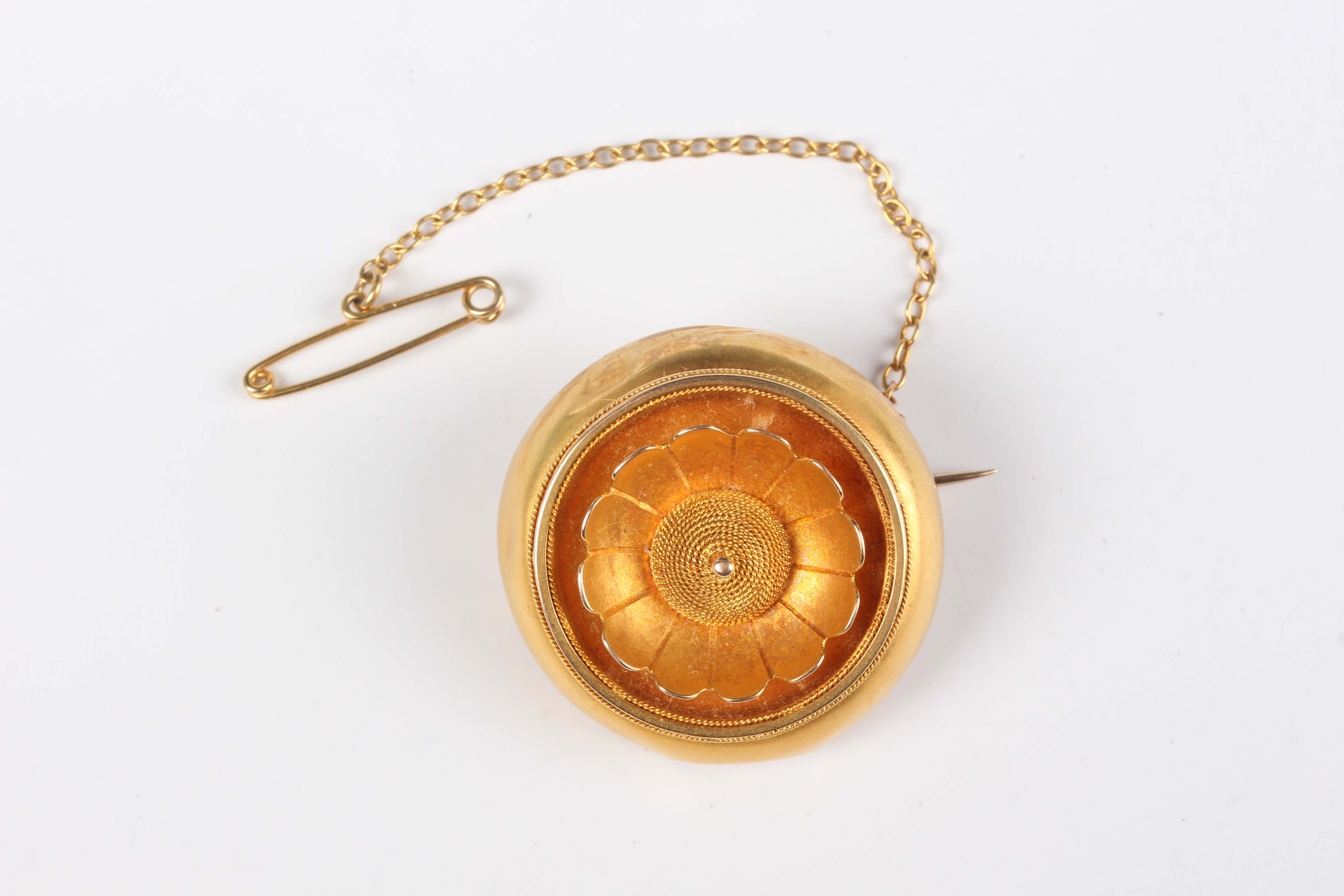 A Victorian gold circular brooch, the centre with a flowerhead shaped motif, the back glazed with a locket compartment, weight 9.4g, diameter 2.8cm.
