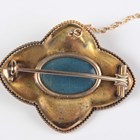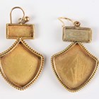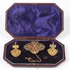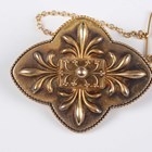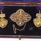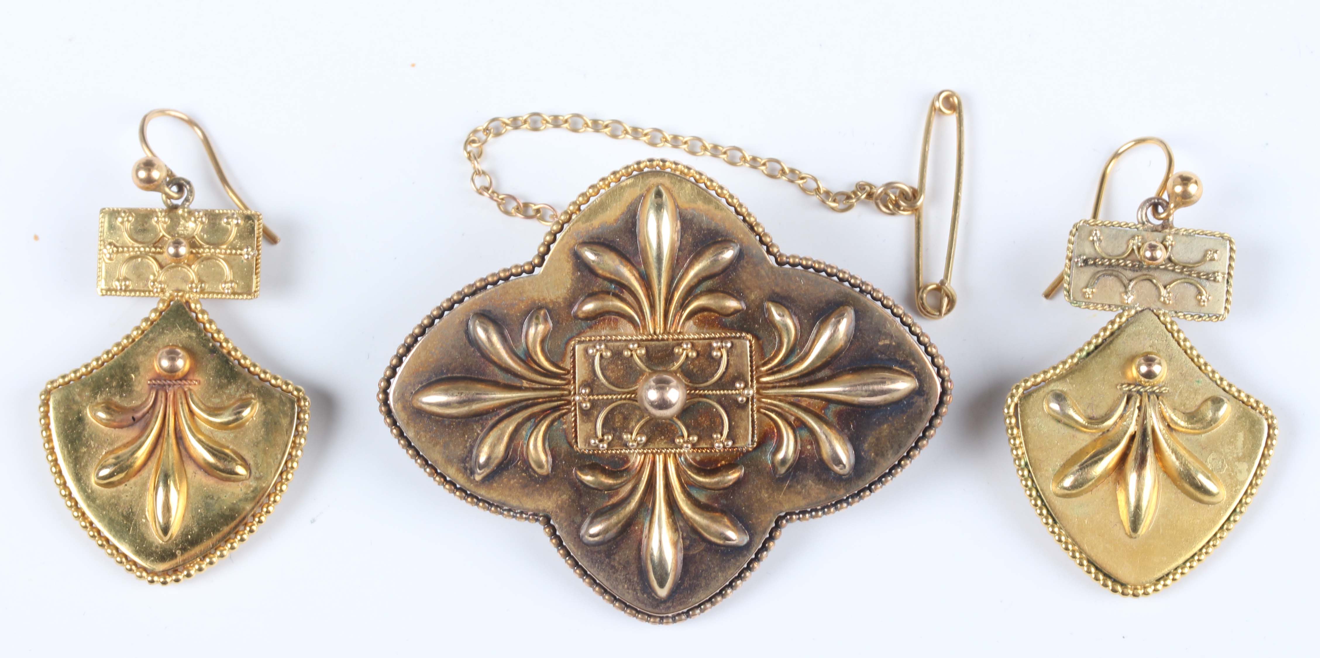 A Victorian gold brooch of quatrefoil shaped form, width 4.2cm, and a matching pair of pendant earrings with wire fittings, length 3.6cm, each in a classical design with applied decoration, total weight 16.5g, with the original fitted case.