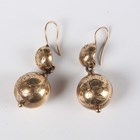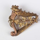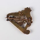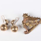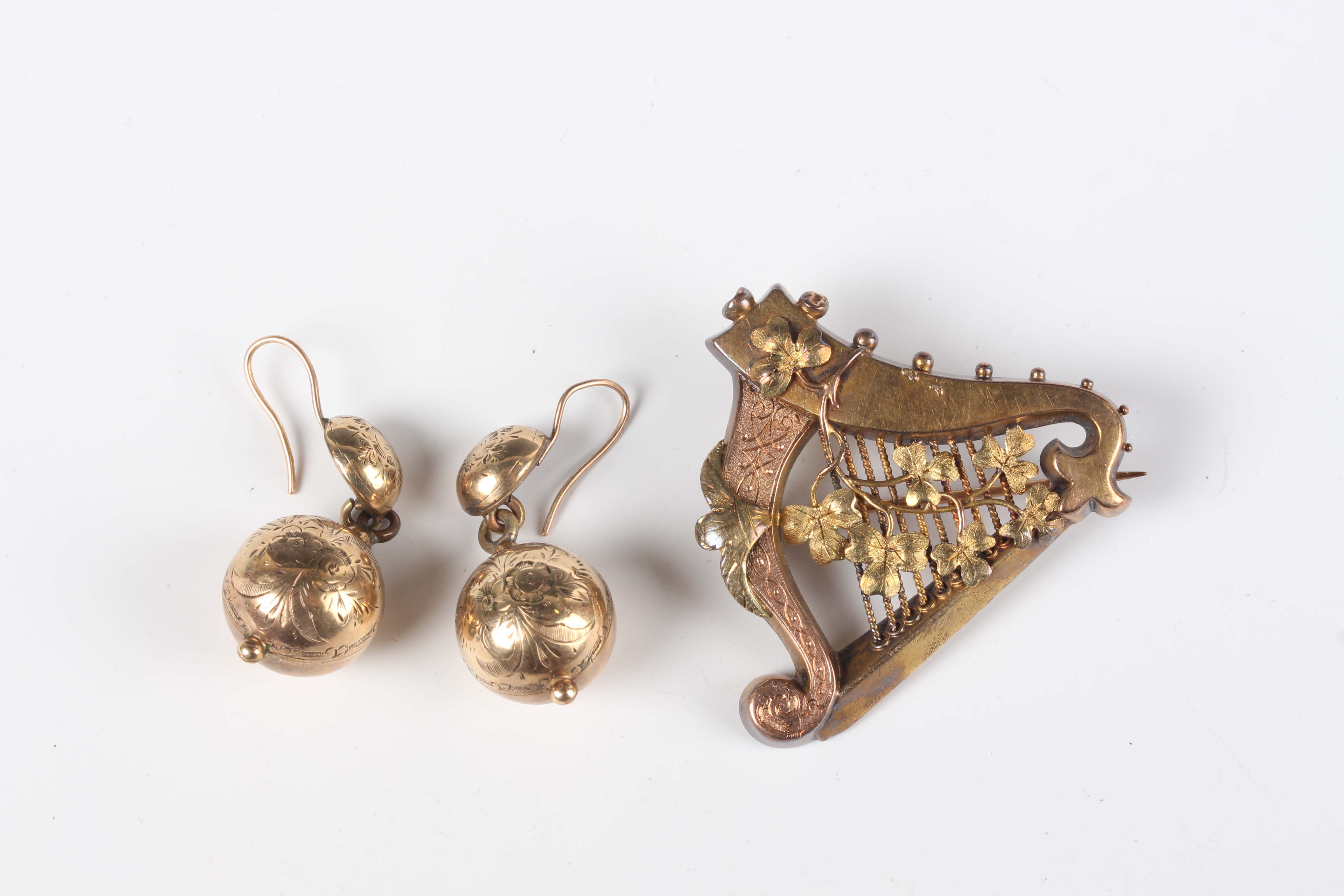 A Victorian gold brooch, designed as a harp, decorated with applied shamrocks, unmarked, weight 7.4g, width 3.8cm, and a pair of Victorian gold and gilt metal spherical pendant earrings, weight 5.4g.