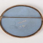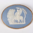 A gold mounted oval Wedgwood brooch, designed as a classical scene of a figure with a horse within a ropetwist wirework border, unmarked, weight 31.7g, width 6.2cm.