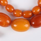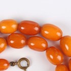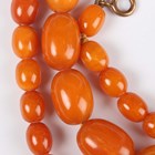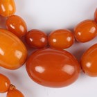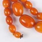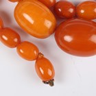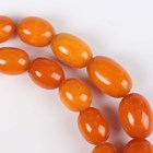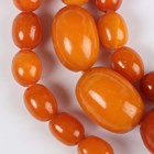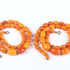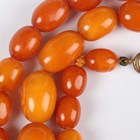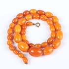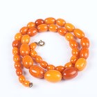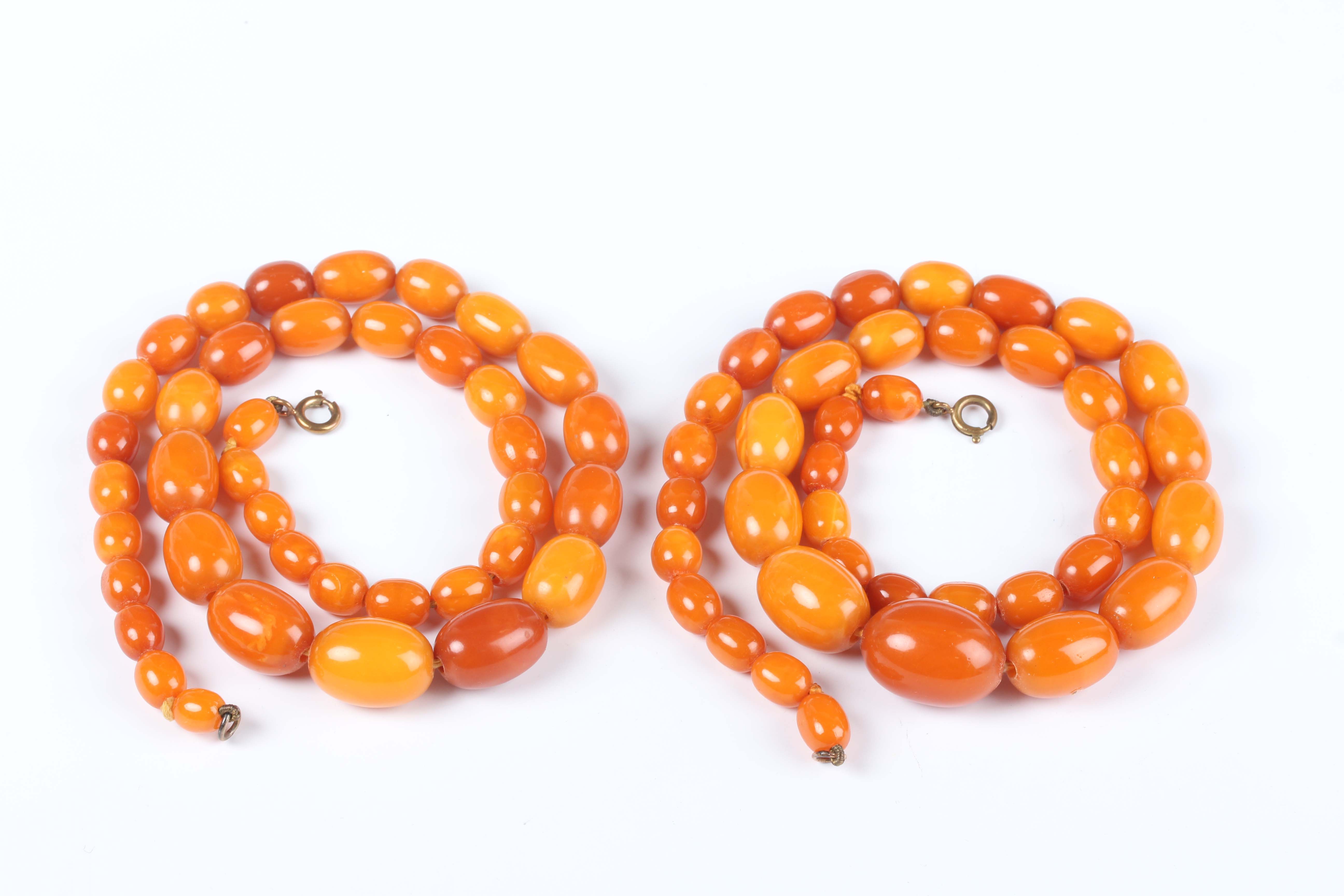 A single row necklace of thirty-nine graduated oval mottled opaque butterscotch coloured amber beads, gross weight 35.8g, total length 55cm, length of largest bead 2.2cm, length of smallest bead 1cm, and another single row necklace of thirty-nine graduated and mottled opaque butterscotch coloured amber beads, gross weight 31.7g, total length 52cm, length of largest bead 1.9cm, length of smallest bead 8mm.
