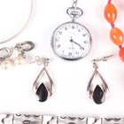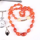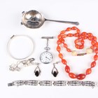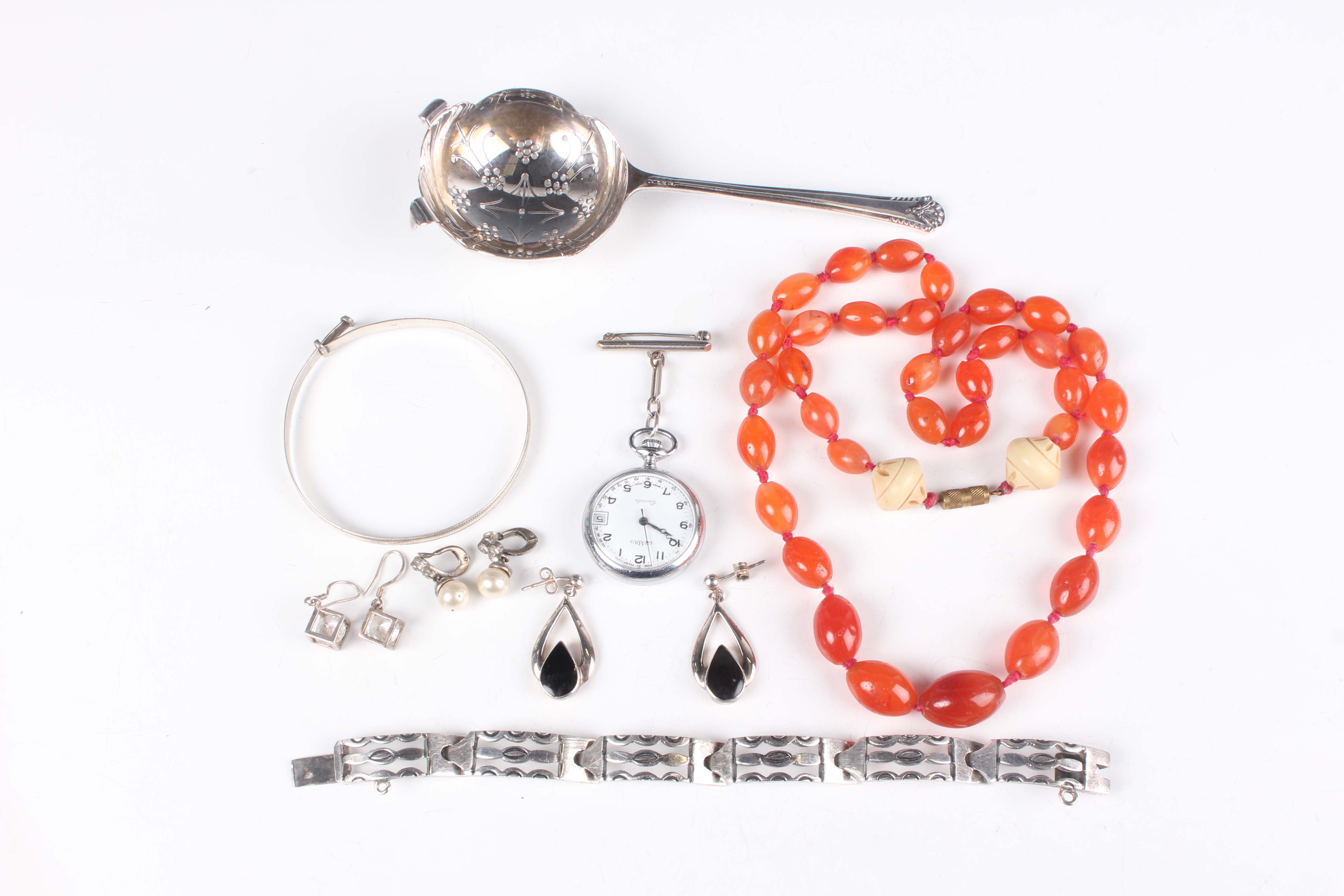 A silver bracelet of curved panel form link design, a cornelian bead necklace, a Gradus Quartz brooch mounted watch, two pairs of earrings and a few further items, including a silver tea strainer, weight of silver 86.2g.