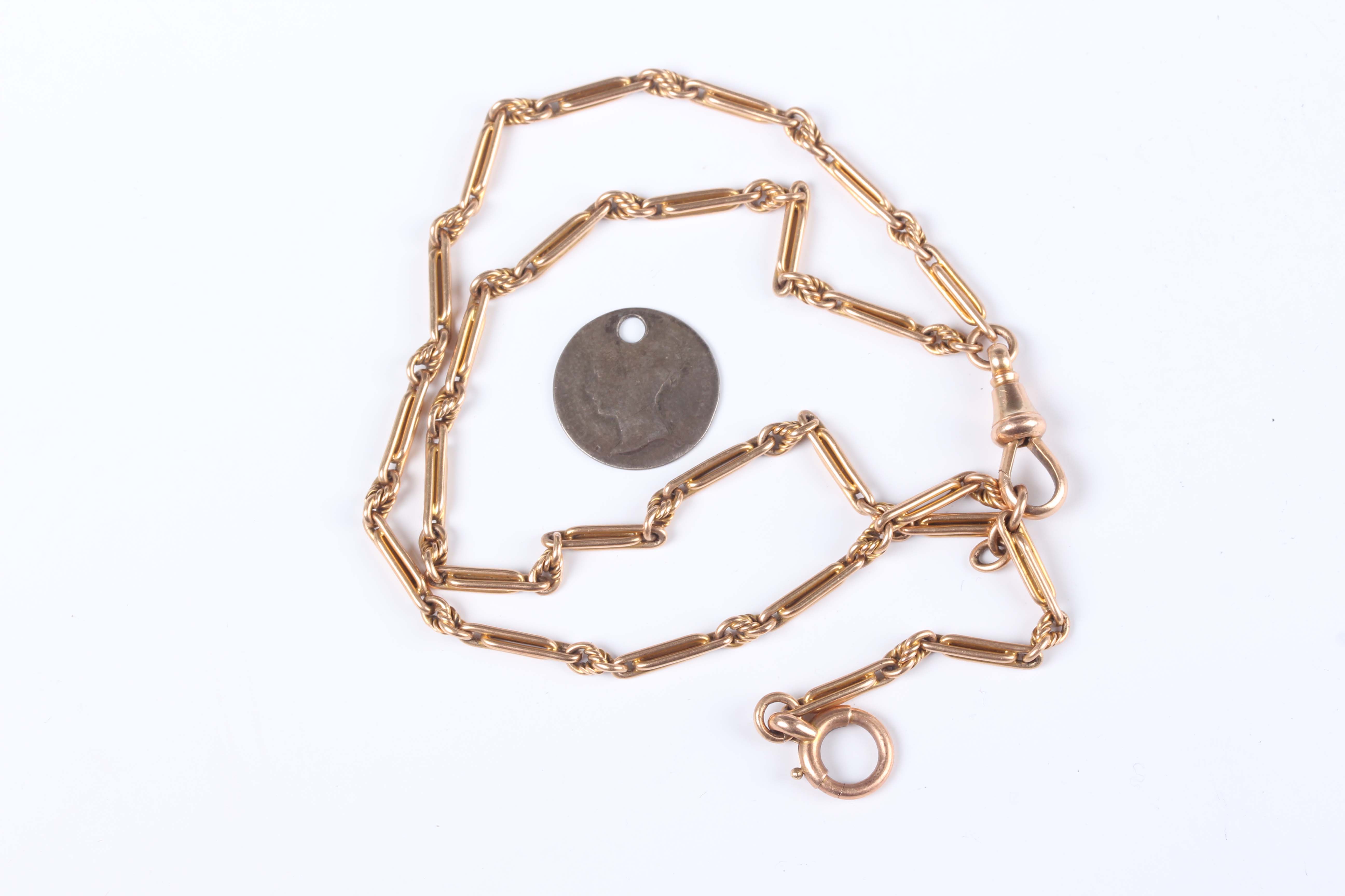 A gold bar and multiple link two row bracelet, fitted with a swivel and boltring clasp, detailed '15', weight 15.8g, total length 24cm, with a Victoria Young Head threepence 1865 (pierced).
