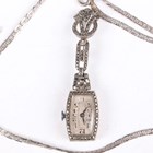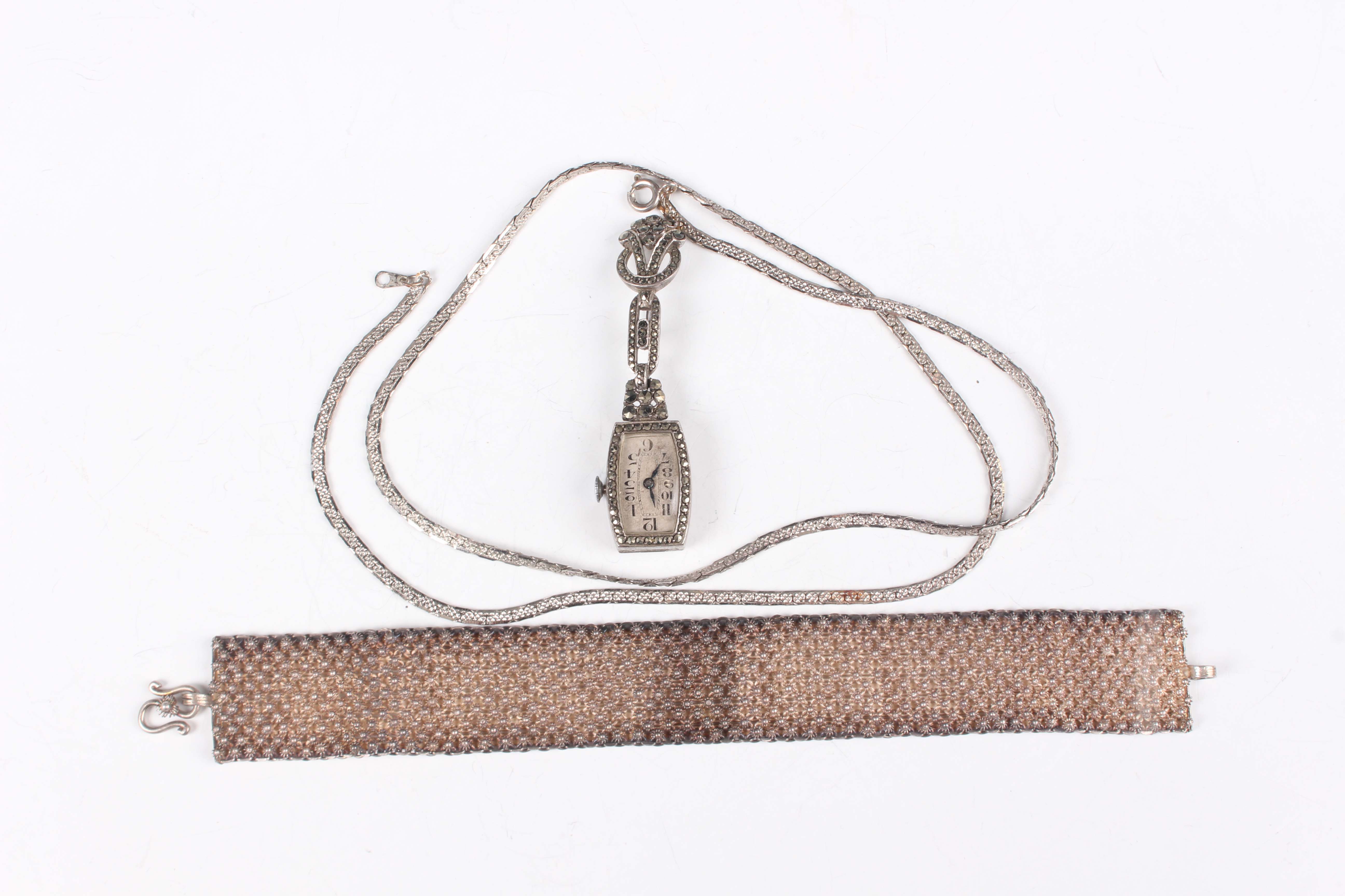 A silver cased and marcasite set lady's pendant brooch watch, the silvered dial with Arabic numerals, total weight 12.3g, length 6cm, a silver mesh and bead link bracelet on a hook shaped clasp, weight 33.5g, length 18cm, and a neckchain.
