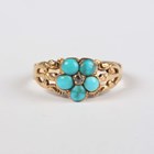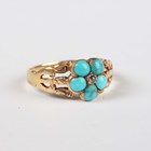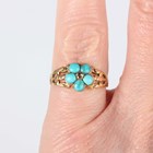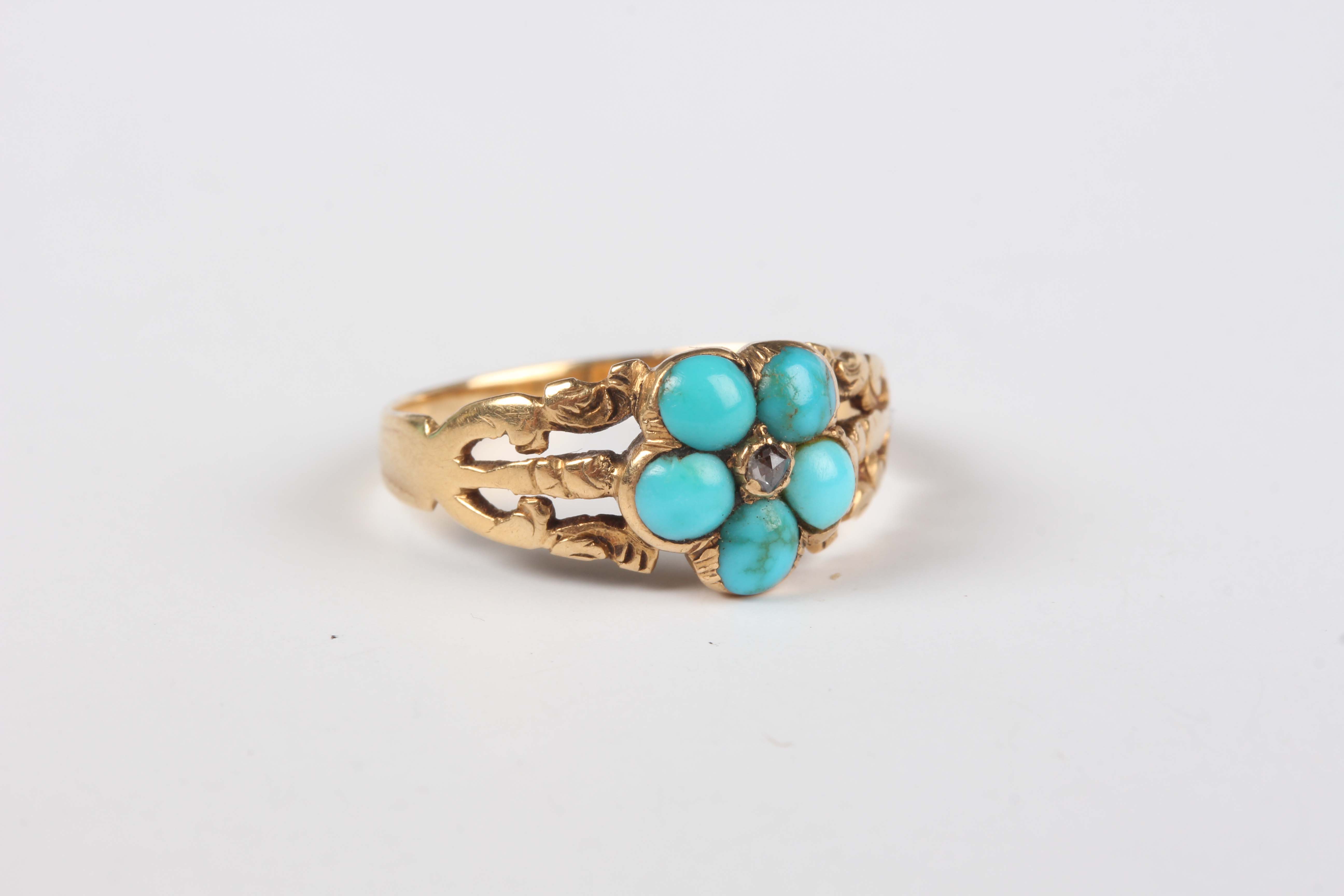 A Victorian gold, turquoise and rose cut diamond ring, designed as a forget-me-not, mounted with a central rose cut diamond within a surround of five turquoises, between split shoulders, unmarked, weight 2.1g, ring size approx L.