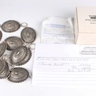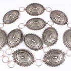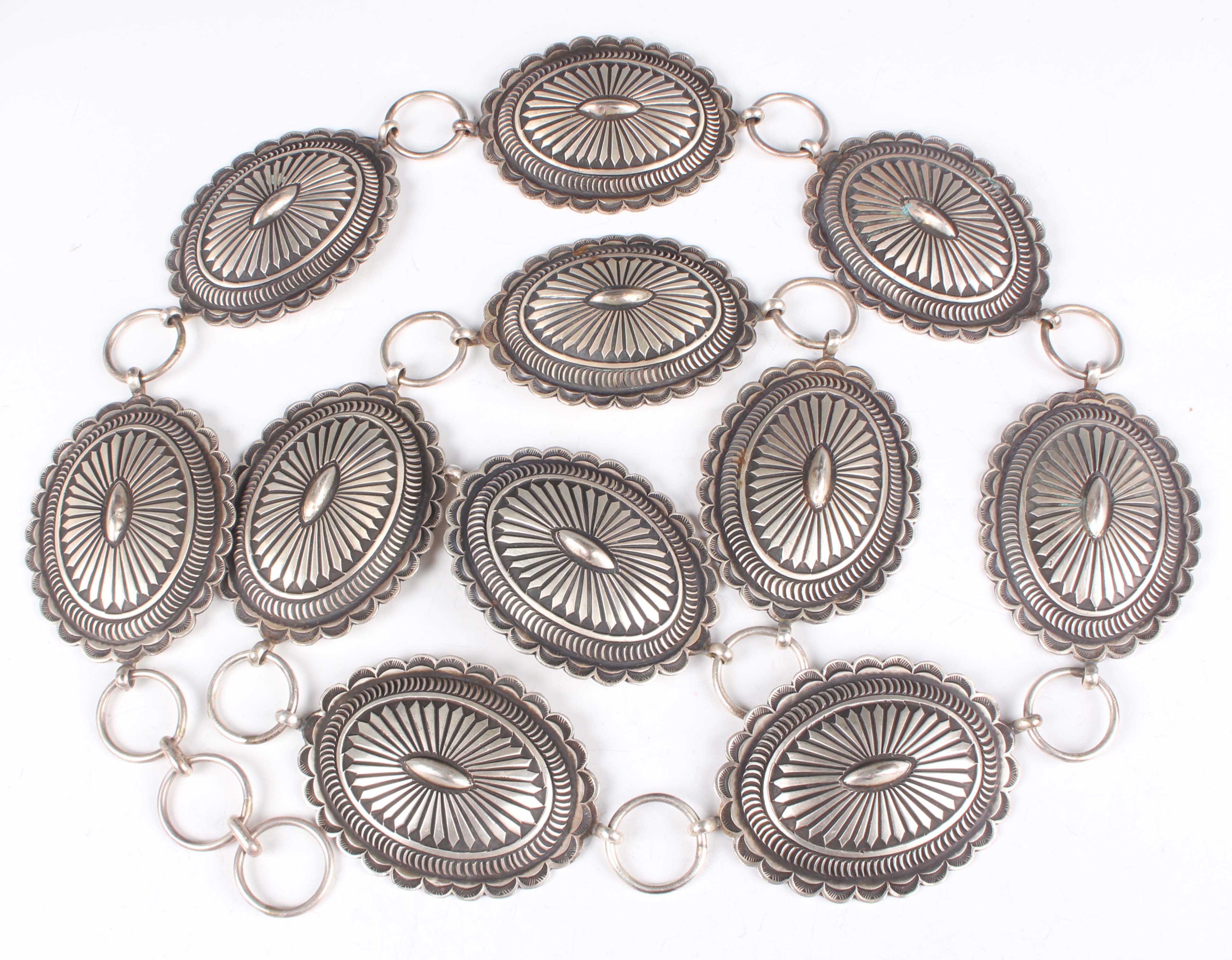 A Navajo silver concho belt by Calvin Martinez, designed as oval panel shaped links with radiating decoration, detailed 'C.MTZ', weight 423.5g, length 105cm, with a box.