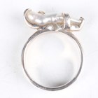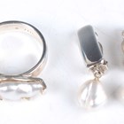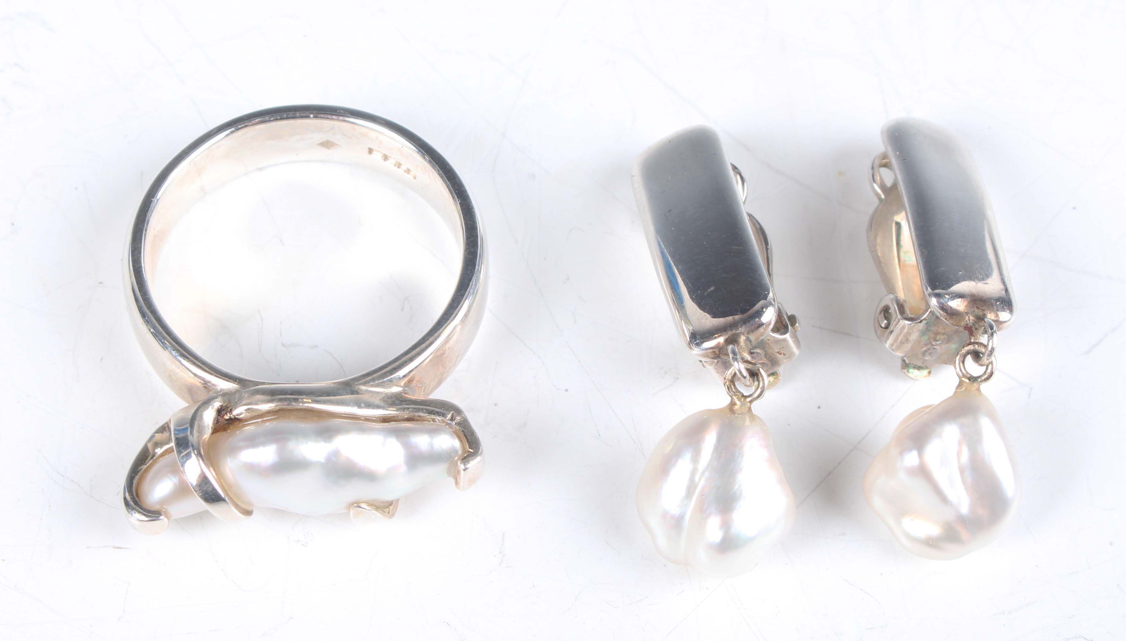 A silver and Keshi baroque pearl ring, ring size approx S, and a matching pair of earclips, length 3.3cm, total weight 16.5g, both cased.