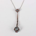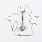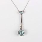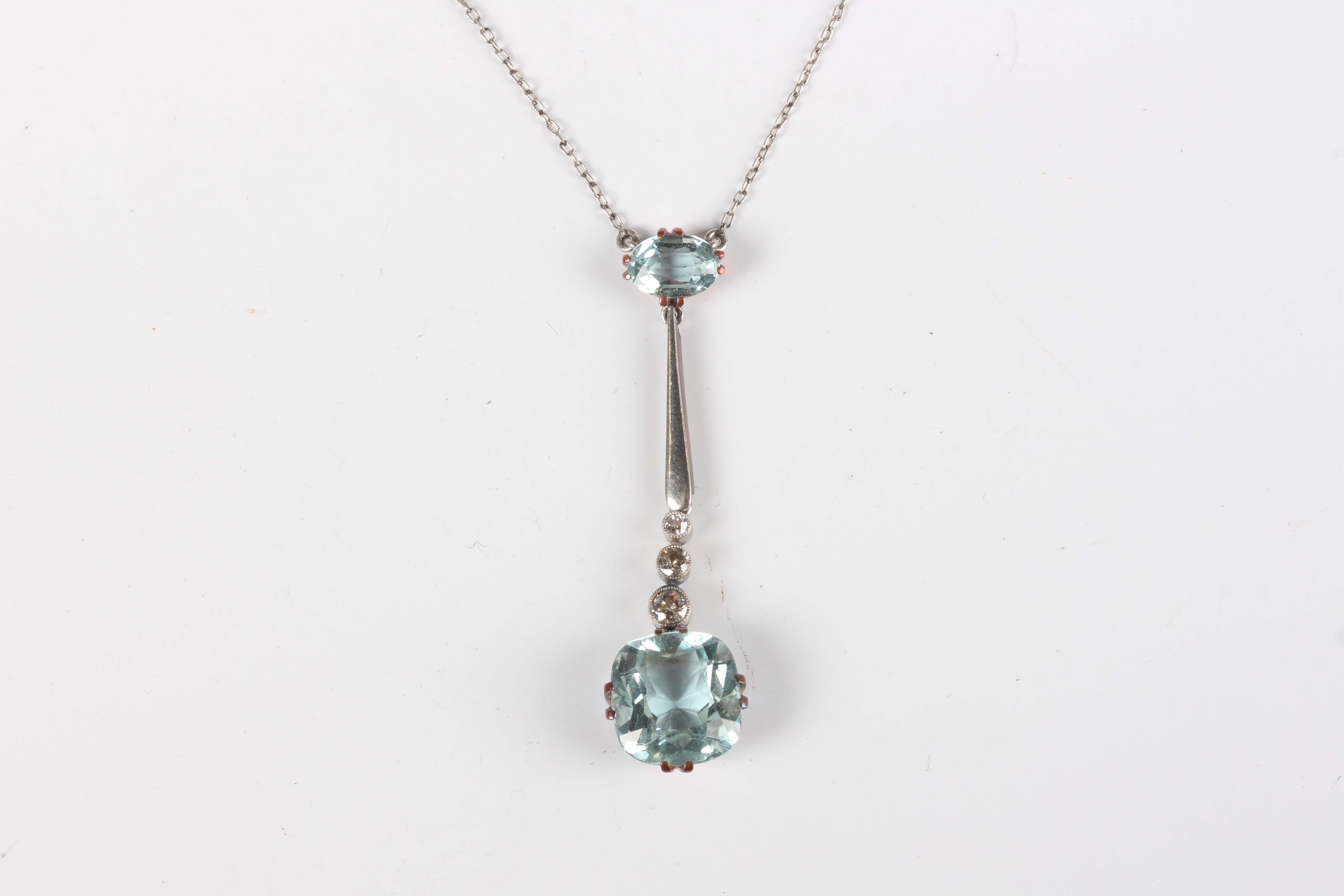 An aquamarine and diamond pendant necklace, the front claw set with the principal cushion shaped aquamarine below three graduated circular cut diamonds, a tapering bar and a smaller oval cut aquamarine, on a fine link neckchain with a boltring clasp, unmarked, weight 5.3g, principal aquamarine weight approx 4.80ct, length 40cm, with a case.