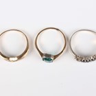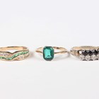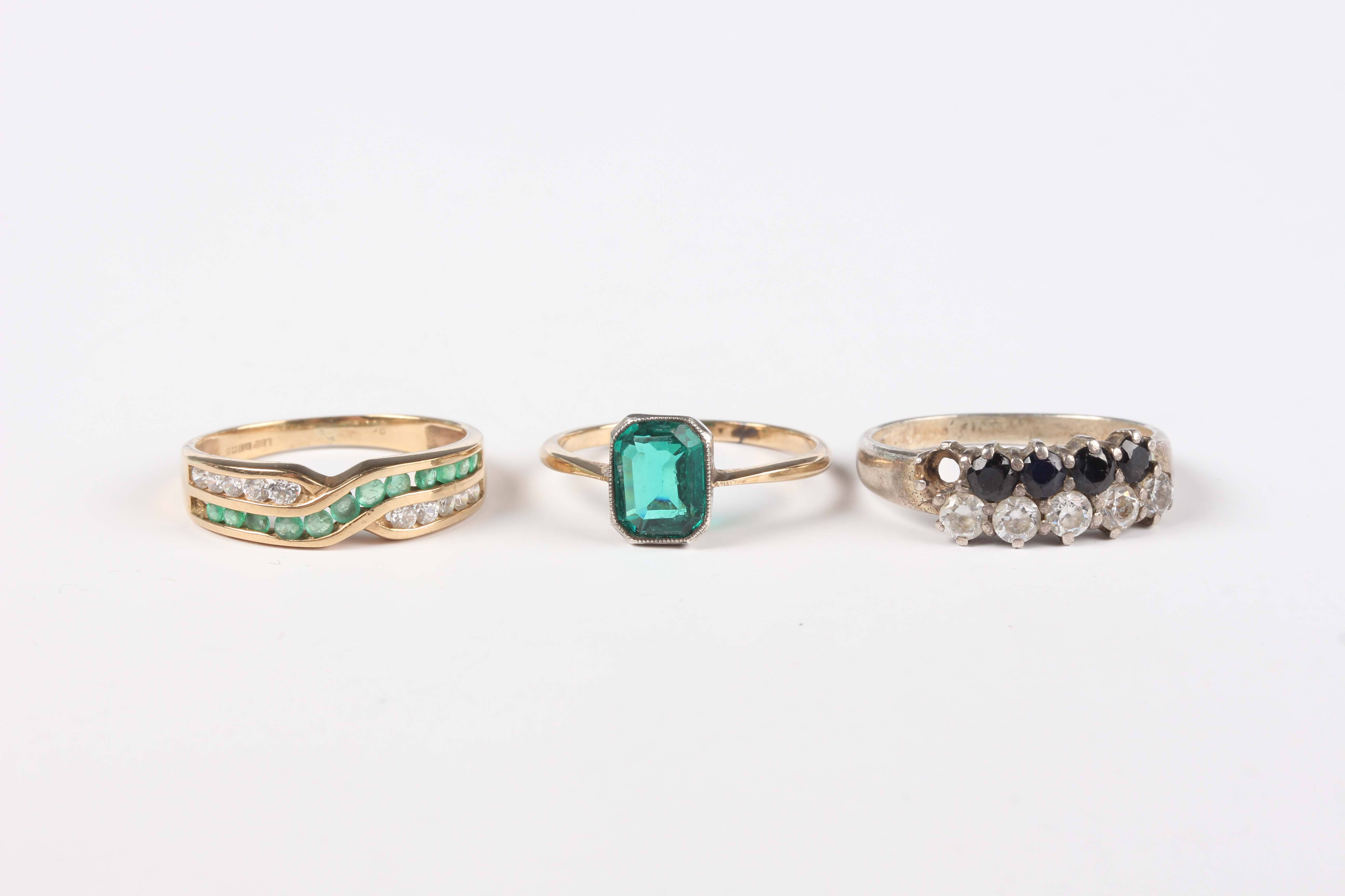 A 9ct gold, emerald and colourless gem set ring in a crossover design, import mark London 1990, ring size approx L, a gold ring, mounted with a green paste, detailed ‘9ct’, total weight 3.4g, and a silver and gem set ring (one gem lacking), with a case.