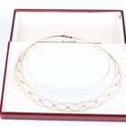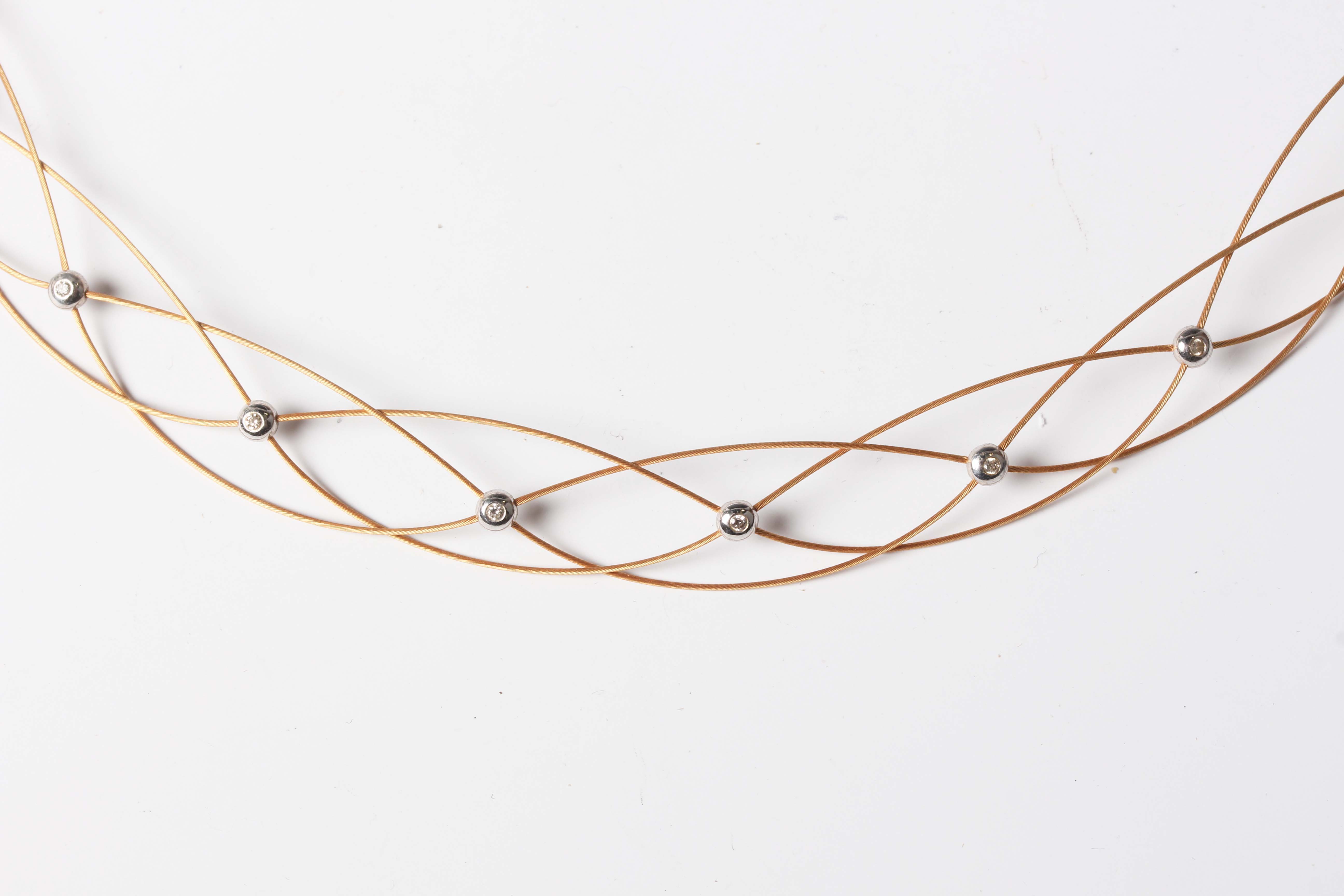 A two colour gold and diamond wirework collar necklace, mounted with thirteen circular cut diamonds, detailed ‘750’, on a sprung hook shaped clasp, detailed ‘750’, weight 7.8g, length 43cm, with a case.