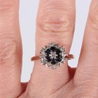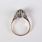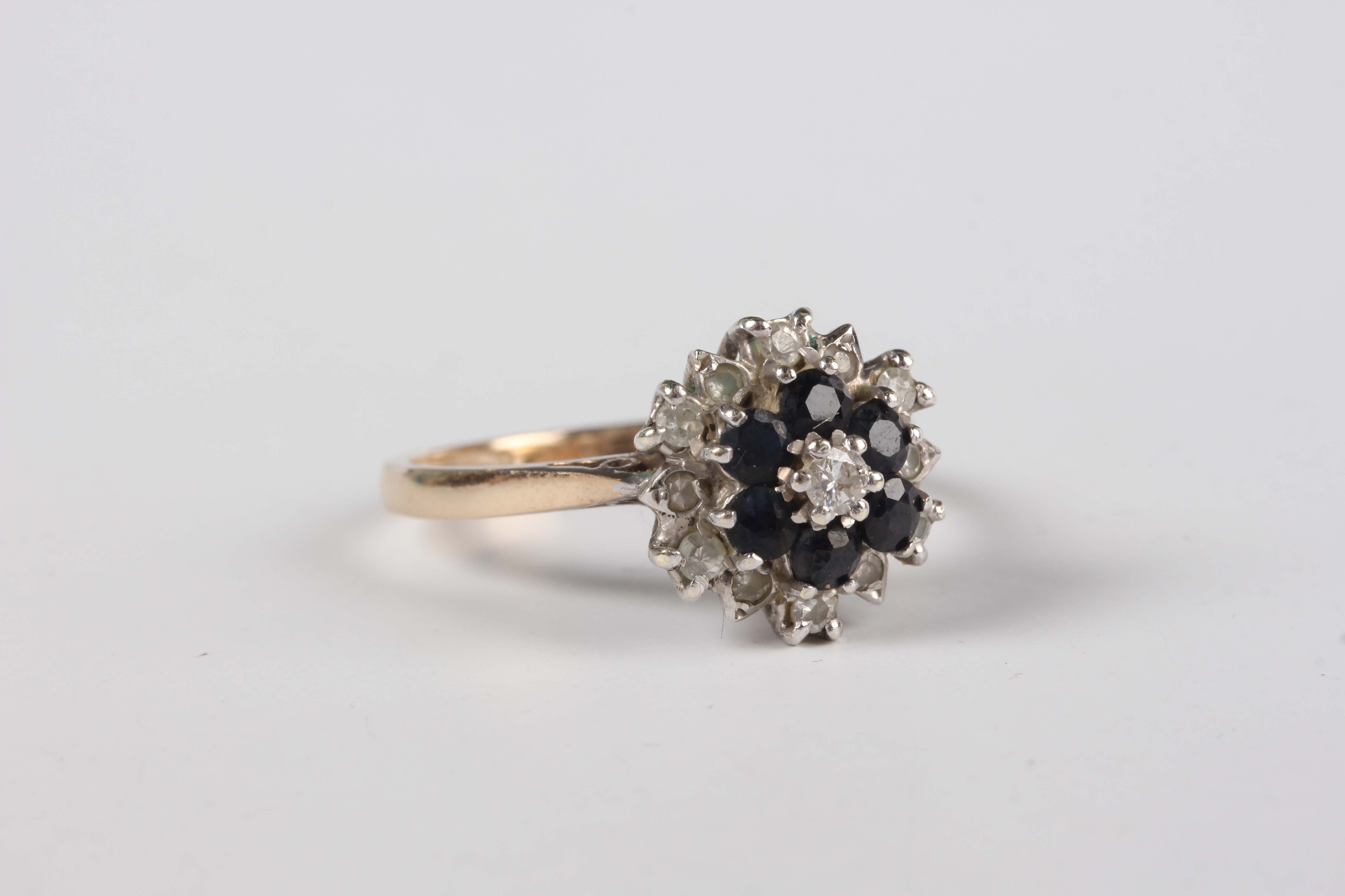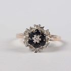A 9ct gold, sapphire, diamond and colourless gem set cluster ring, weight 3.4g, ring size approx P1/2, with a case.