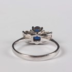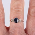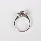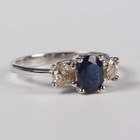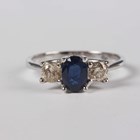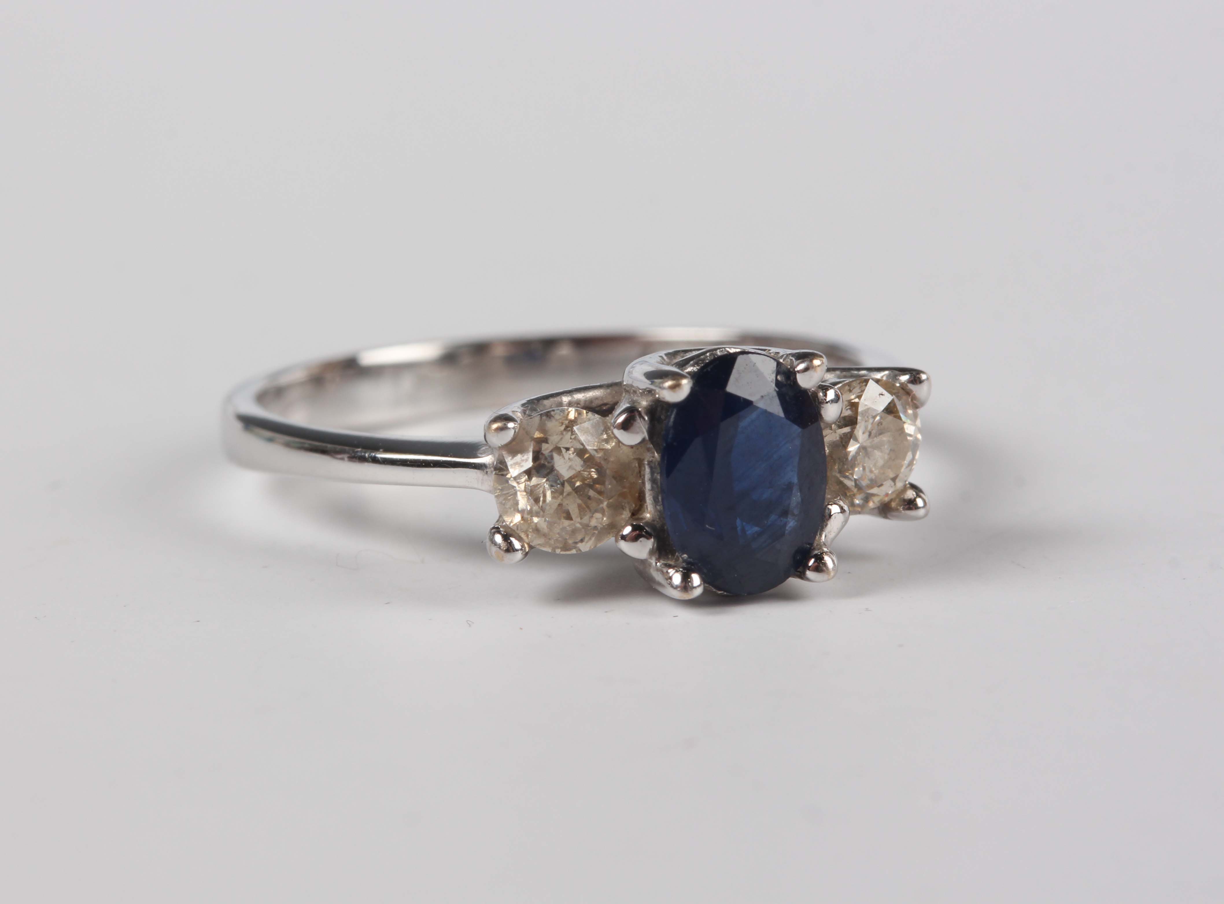 An 18ct white gold, sapphire and diamond three stone ring, claw set with an oval cut sapphire between two circular cut diamonds, weight 3.4g, ring size approx O1/2, with a case.
