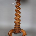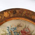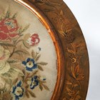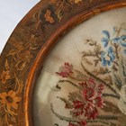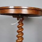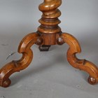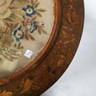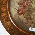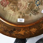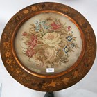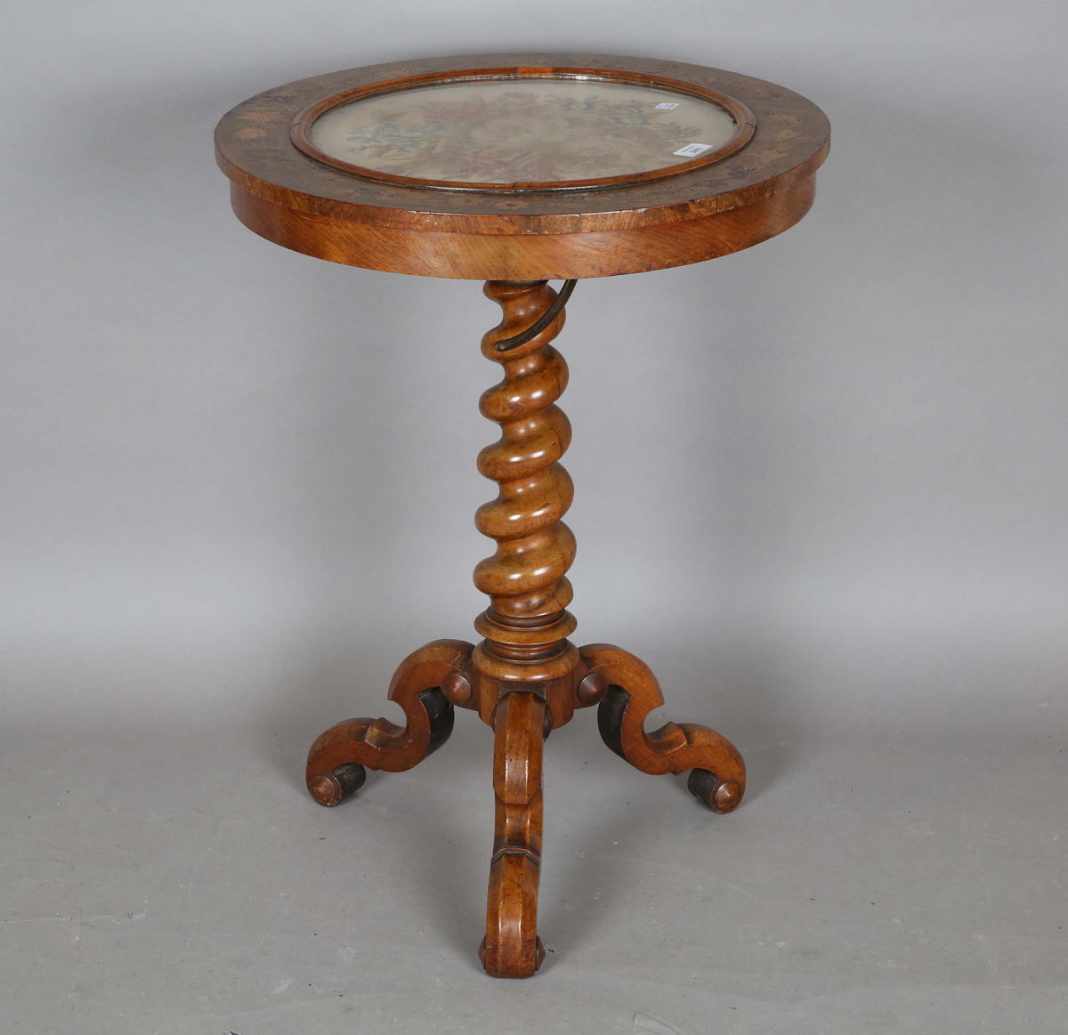A mid-Victorian walnut tip-top wine table, the top inset with a floral woolwork within a foliate inlaid border, raised on tripod legs, height 73.5cm, diameter 54cm.