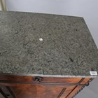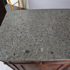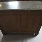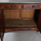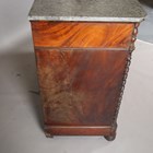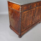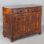 A late 19th century French flame mahogany side cabinet, the grey marble top above two oak-lined drawers and two doors, height 103cm, width 130cm, depth 56cm.
