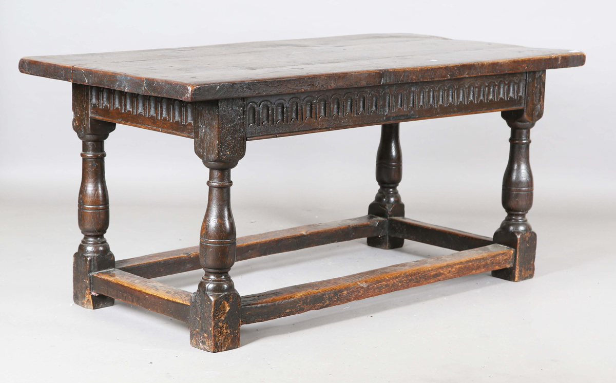A 17th century and later oak refectory table, the three-plank top above a stop fluted frieze, height 76cm, length 167cm, depth 78cm (alterations).