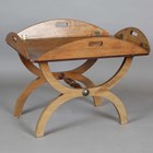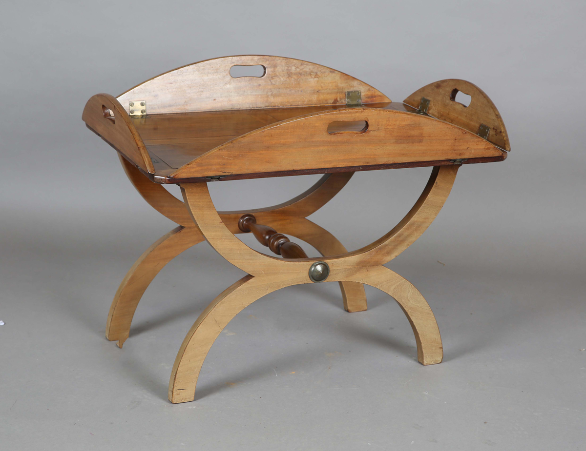 A 19th century flame mahogany folding butler's tray with pierced handles and brass hinges, width 95cm, depth 74cm, raised on a later 'X' frame stand.
