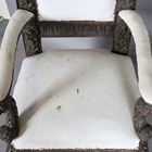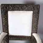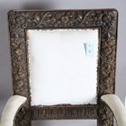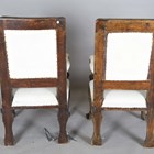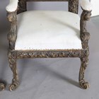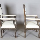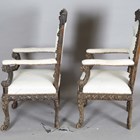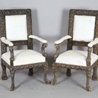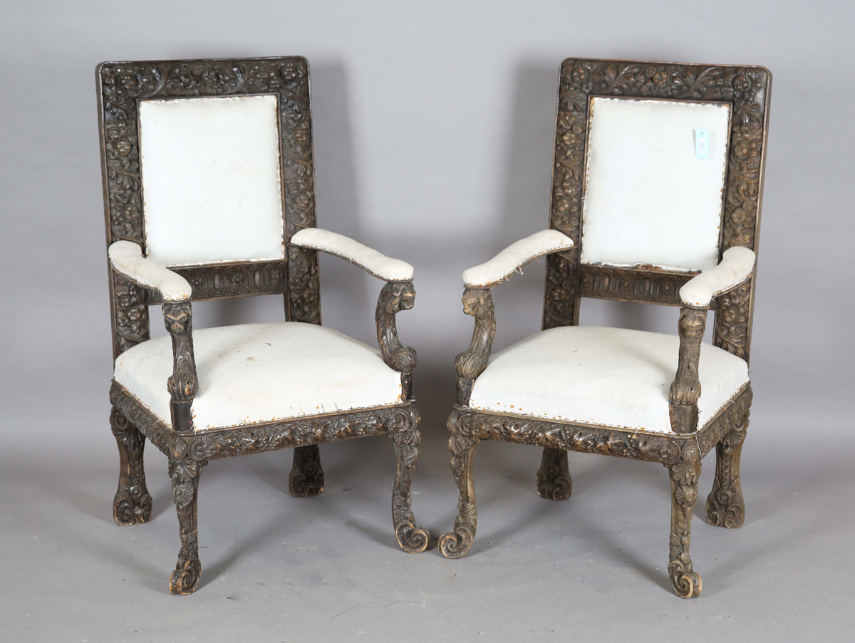 A pair of 19th century Baroque Revival carved oak elbow chairs, the frames carved with fruit and scrolling foliage, the armrests with lion head supports, height 114cm, width 61cm, depth 62cm.