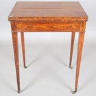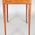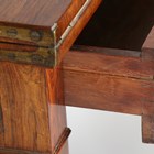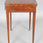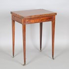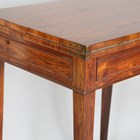 A good George III kingwood writing table, in the manner of Gillows of Lancaster, the double-hinged top enclosing a baize writing surface, the frieze fitted with a single drawer and a pair of button-operated lopers, on square tapering legs and brass castors, height 73cm, width 56cm, depth 40.5cm.