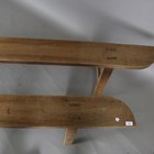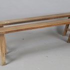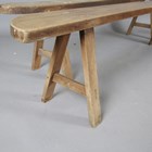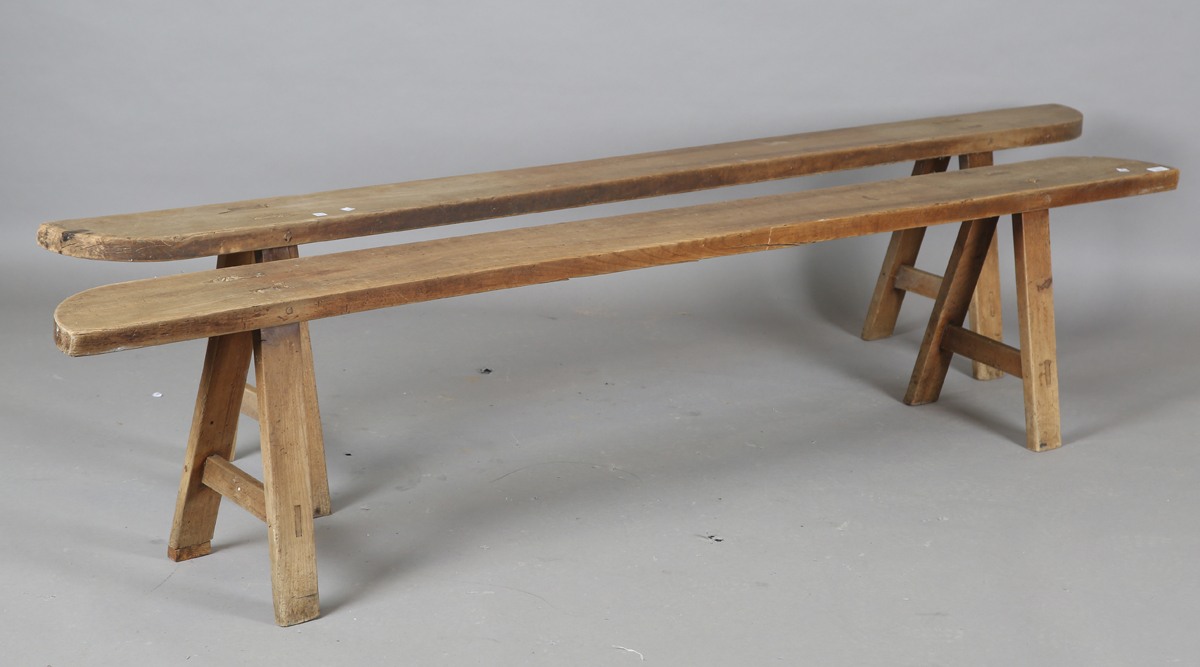 A pair of 19th century primitive elm benches with shaped seats and 'A' frame supports, height 45cm, length 217cm, depth 17cm.