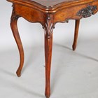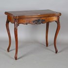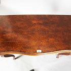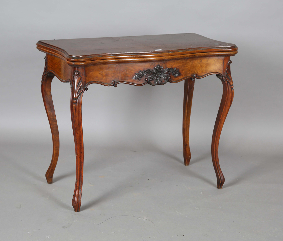 A mid-Victorian burr walnut fold-over card table, the shaped top above carved cabriole legs, height 73cm, width 87cm, depth 44cm.