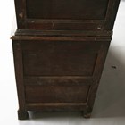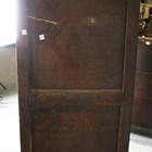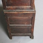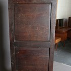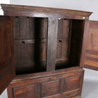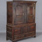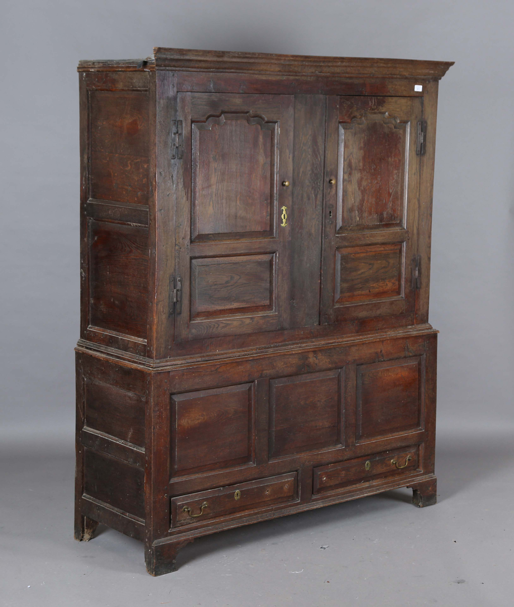 A George III Lancastrian oak hall or livery cupboard, fitted with two arched panel doors above two lower drawers, height 175.5cm, width 140cm, depth 52cm (faults).