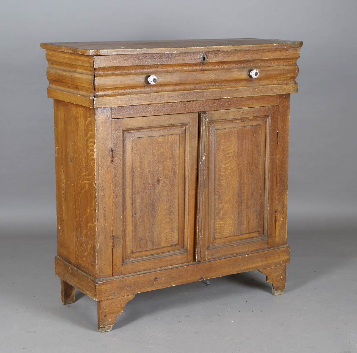 A 19th century Continental scumbled pine side cabinet, fitted with a drawer and two doors, height 118cm, width 109cm, depth 46cm.