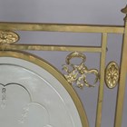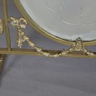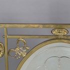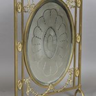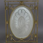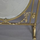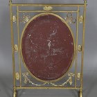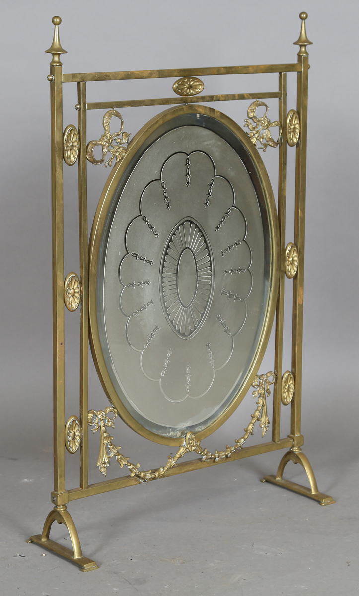 An Edwardian Neoclassical Revival brass framed firescreen, inset with an acid etched glass panel, height 79cm, width 50cm.