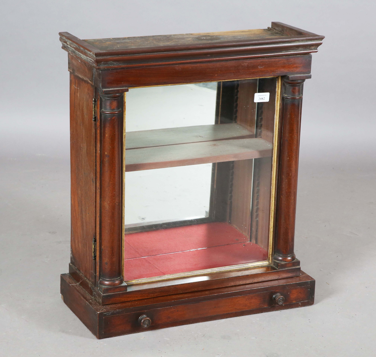 A 19th century and later mahogany display case, the glazed door enclosing a mirrored interior above a drawer, height 64cm, width 55cm, depth 24.5cm (alterations).