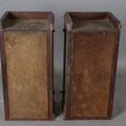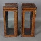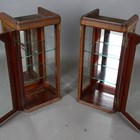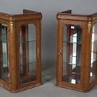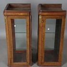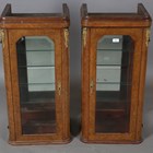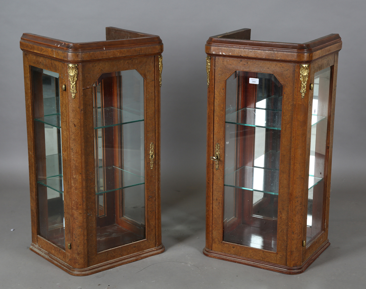 A pair of early 20th century French burr walnut and gilt metal mounted display cabinets, inset with bevelled glass, height 88cm, width 43cm, depth 38cm (formerly from a larger piece of furniture).