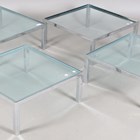 A set of four mid-20th century chromium plated metal framed and glass-topped modular coffee tables, in the manner of Milo Baughman, each table height 20cm, width 51cm.