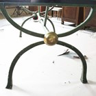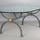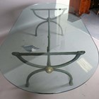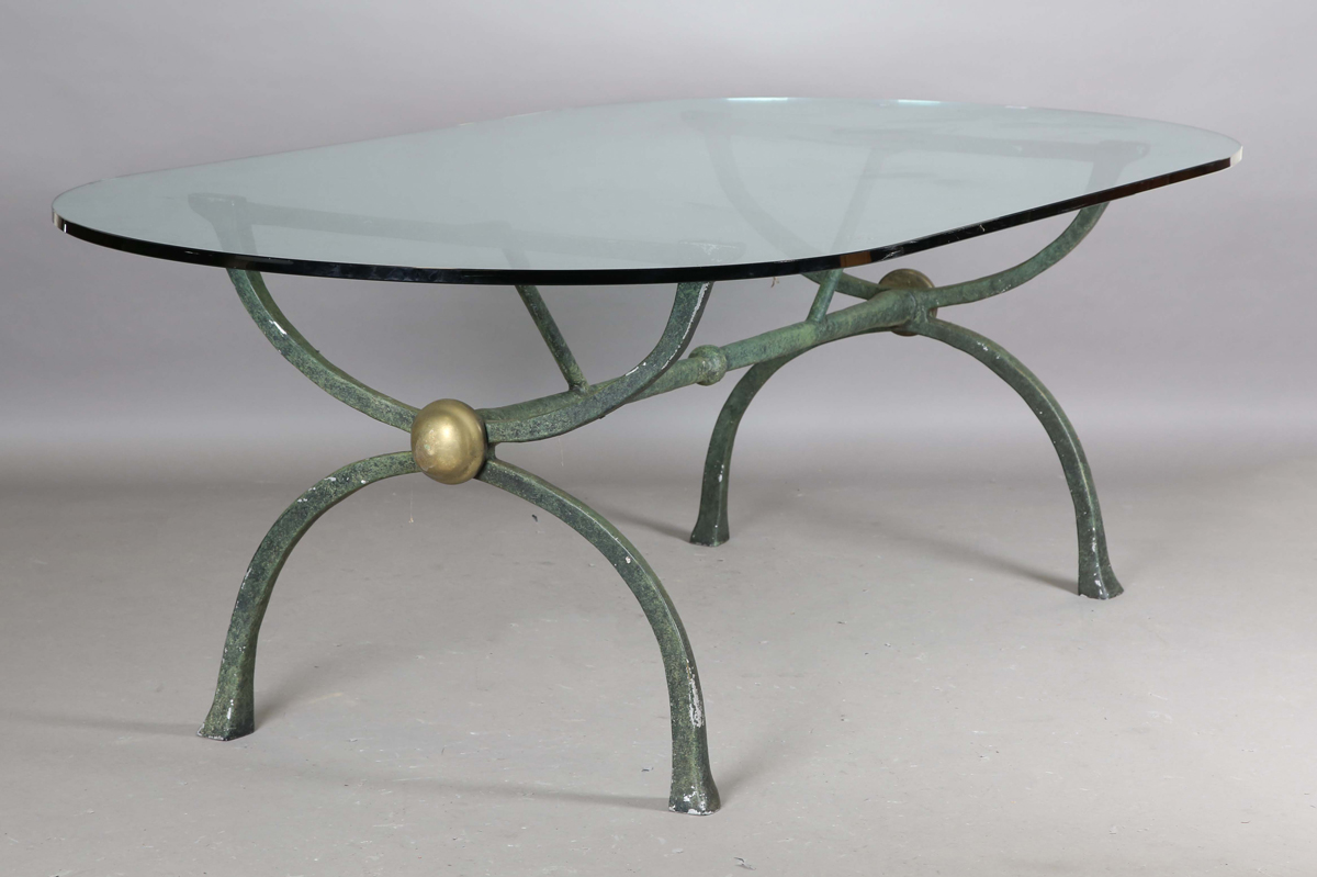 A large late 20th century glass-topped dining or conservatory table, raised on a verdigris patinated metal stand, height 74cm, length 230cm, depth 115cm.