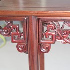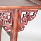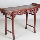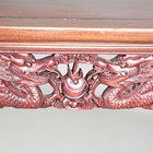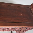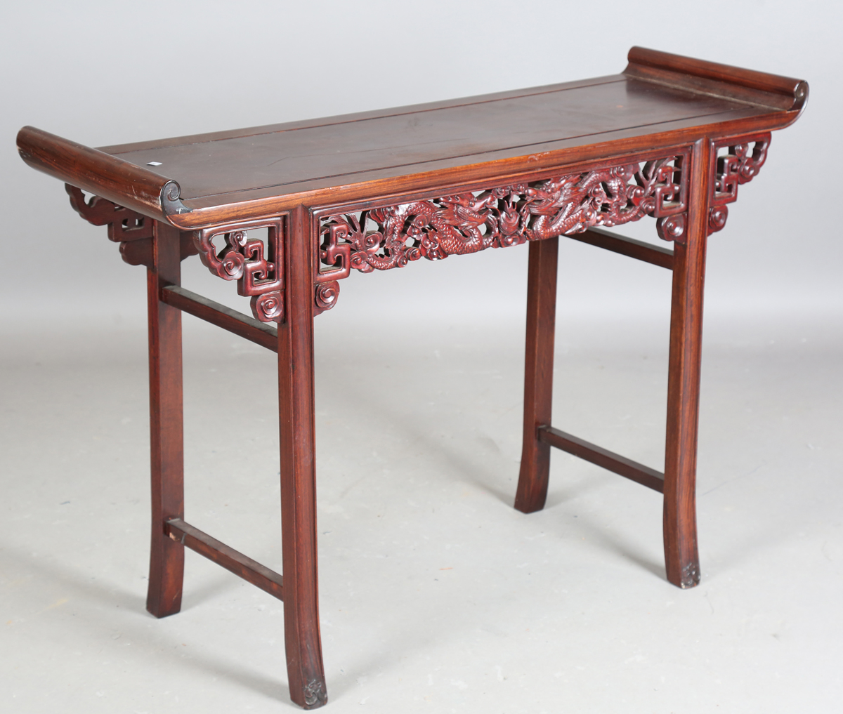 A 20th century Chinese hardwood altar table, the frieze panels carved with dragons chasing the flaming pearl, raised on carved and slightly splayed legs, height 84cm, width 124cm, depth 40cm.