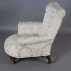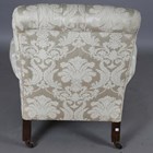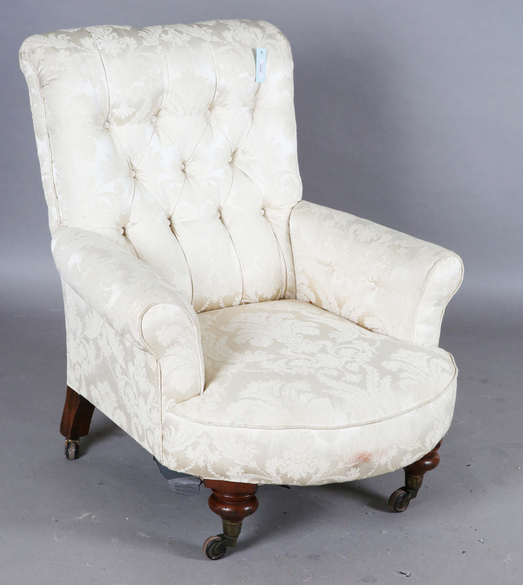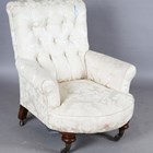 A mid-Victorian buttoned-back armchair, in the manner of Howard & Sons, raised on turned baluster walnut legs and castors, height 90cm, width 79cm, depth 90cm.