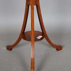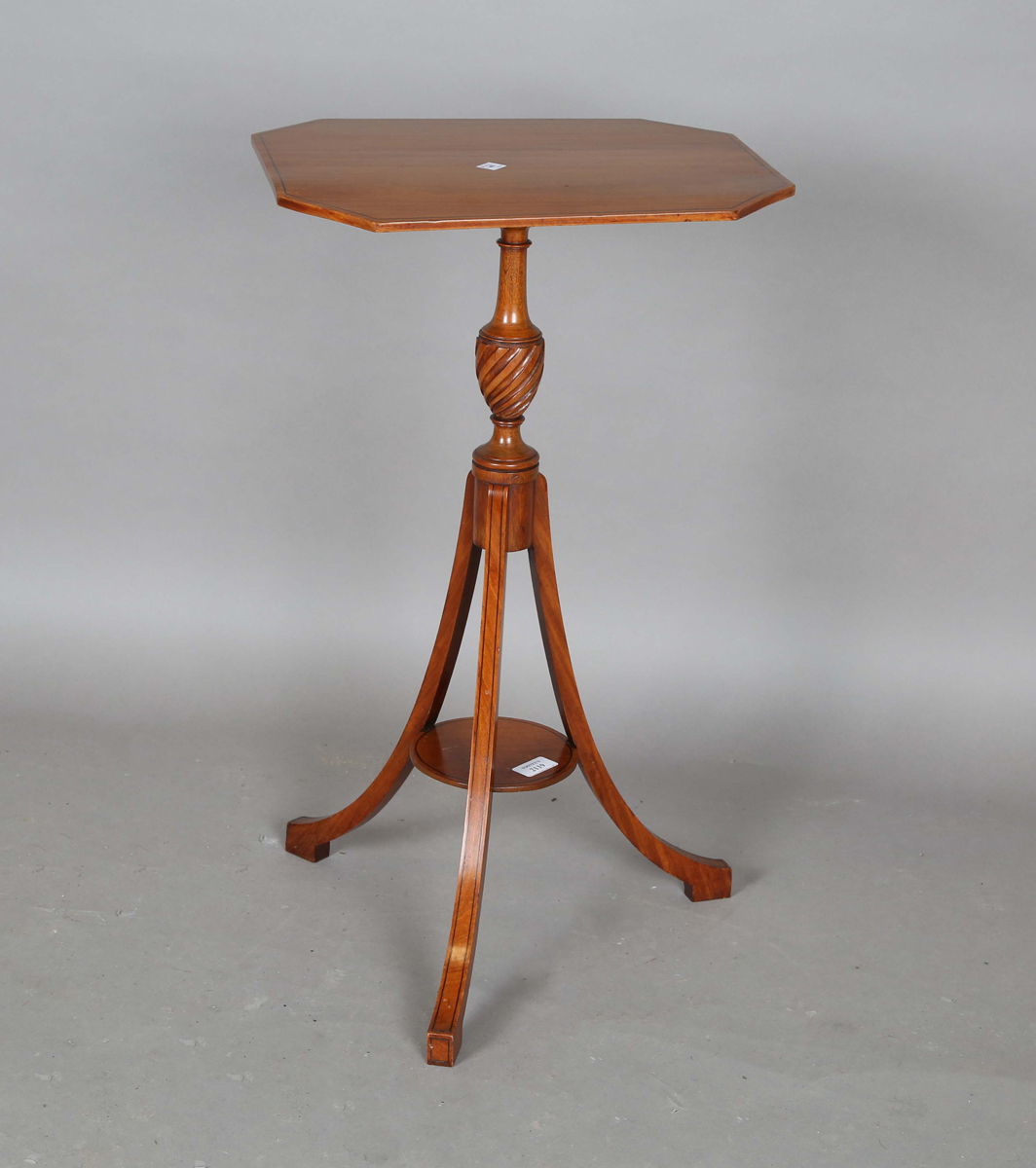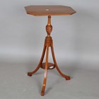 A 20th century George III style satin beech wine table, raised on outswept tripod legs, height 68cm, width 40cm, depth 30cm.