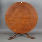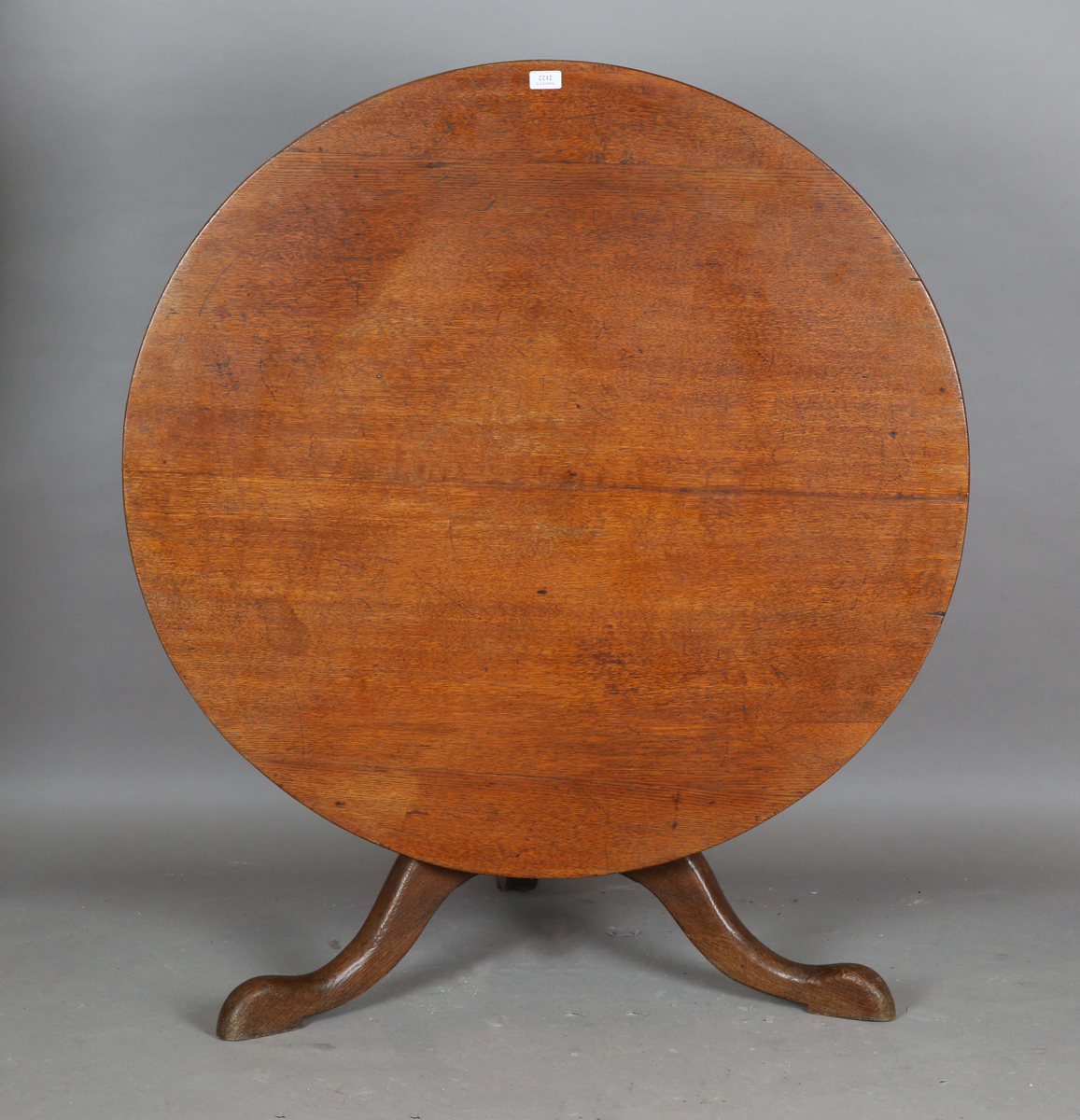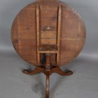 A 19th century oak circular tip-top supper table, on tripod legs, height 54cm, diameter 103cm (cut down stem).