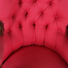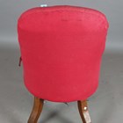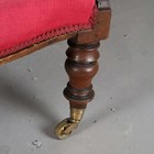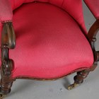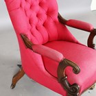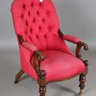 An early Victorian mahogany framed armchair, upholstered in buttoned pink cotton, on turned baluster legs and castors, height 101cm, width 63cm, depth 80cm.