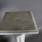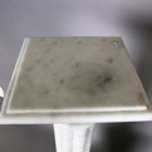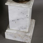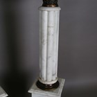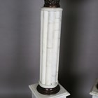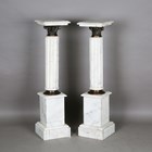 A pair of modern white marble and bronzed metal display pedestals, each square top above a Corinthian capital and reeded stem, height 118cm, width 28cm.