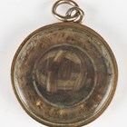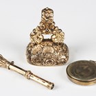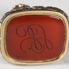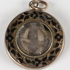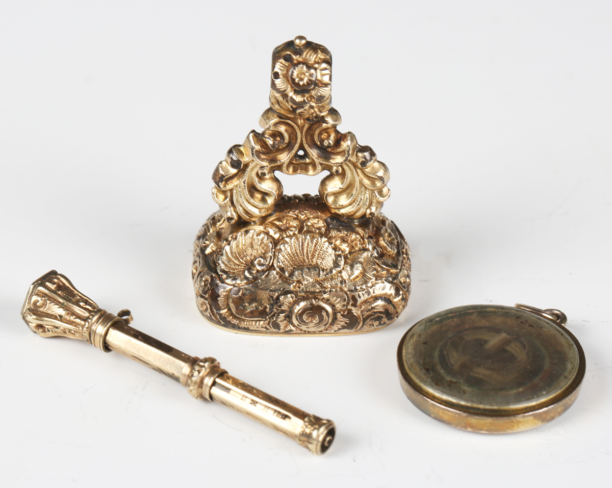 A small Victorian gilt metal slide-action pencil, a Victorian cornelian inset fob seal and a black enamelled circular glazed pendant locket.