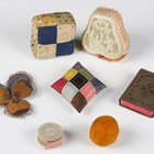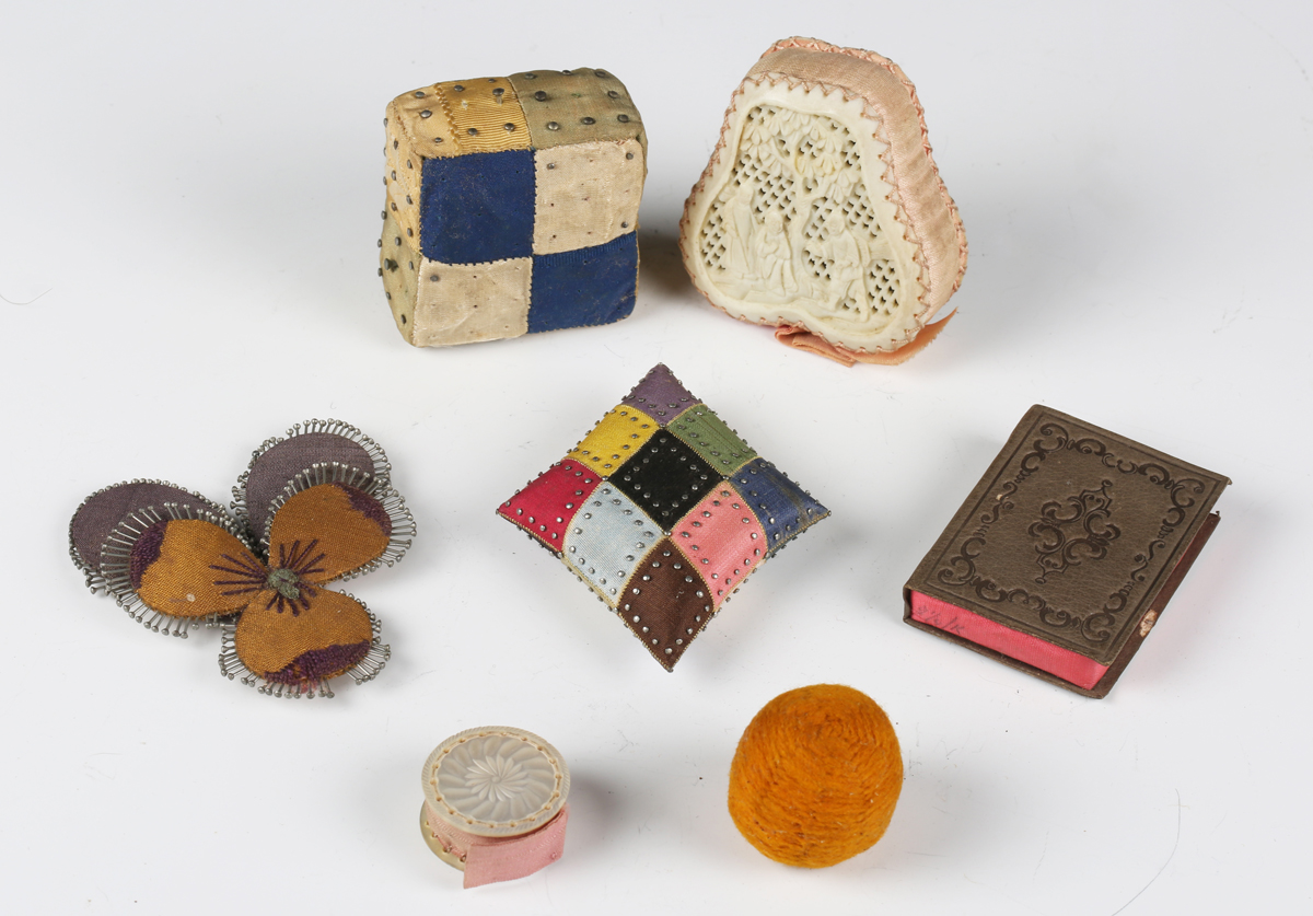 A group of seven Victorian pin cushions, including a shaped Canton example, length 4.5cm, a mother-of-pearl example and one of book form.