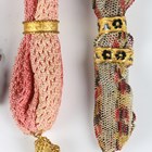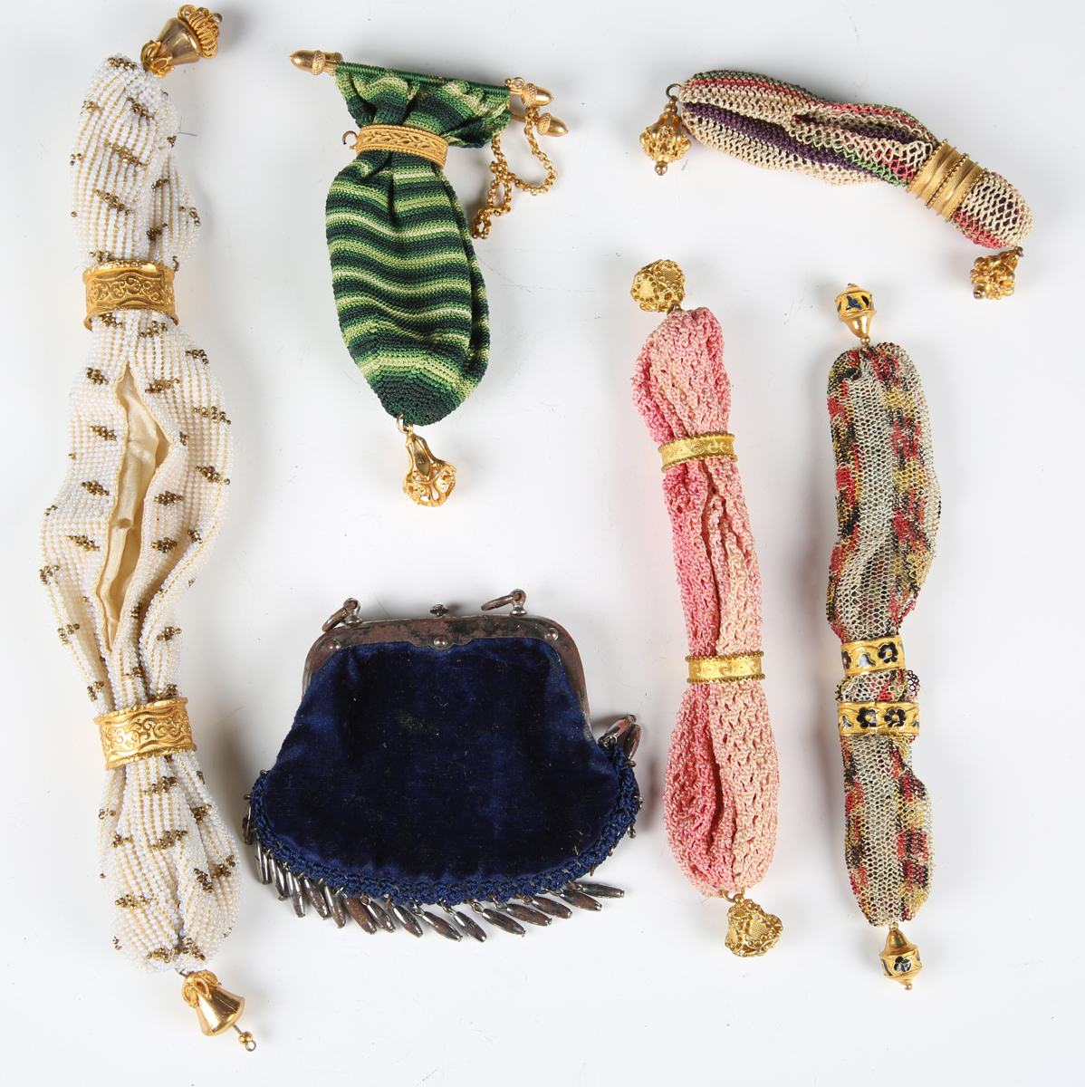 A group of five fine early 19th century gilt metal mounted miser's purses and a blue velvet and steel mounted purse, width 8cm.