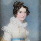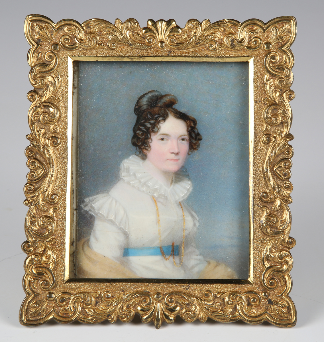 A 19th century British School half-length portrait miniature on ivory, depicting a lady wearing a white dress with blue waistband, 8.5cm x 7cm, mounted within a gilt metal frame. Note: a non-transferrable ivory exemption certificate has been granted for the sale of this item.