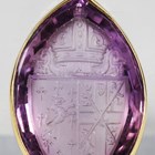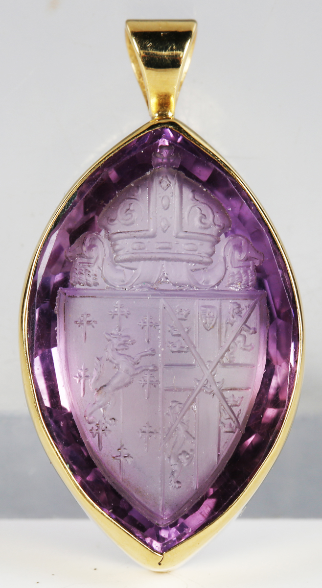 An 18ct gold and amethyst intaglio pendant seal, the marquise shaped intaglio carved with the crest of the Archbishopric of Cape Town, unmarked, length 3.5cm. Note: the carved intaglio is believed to have belonged to Reverend Francis Robinson Phelps (1863-1938).