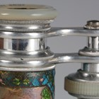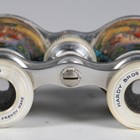 A pair of early 20th century enamelled aluminium and mother-of-pearl mounted opera glasses, the eyepieces detailed 'Hardy Bros. French Make', width 10.5cm.